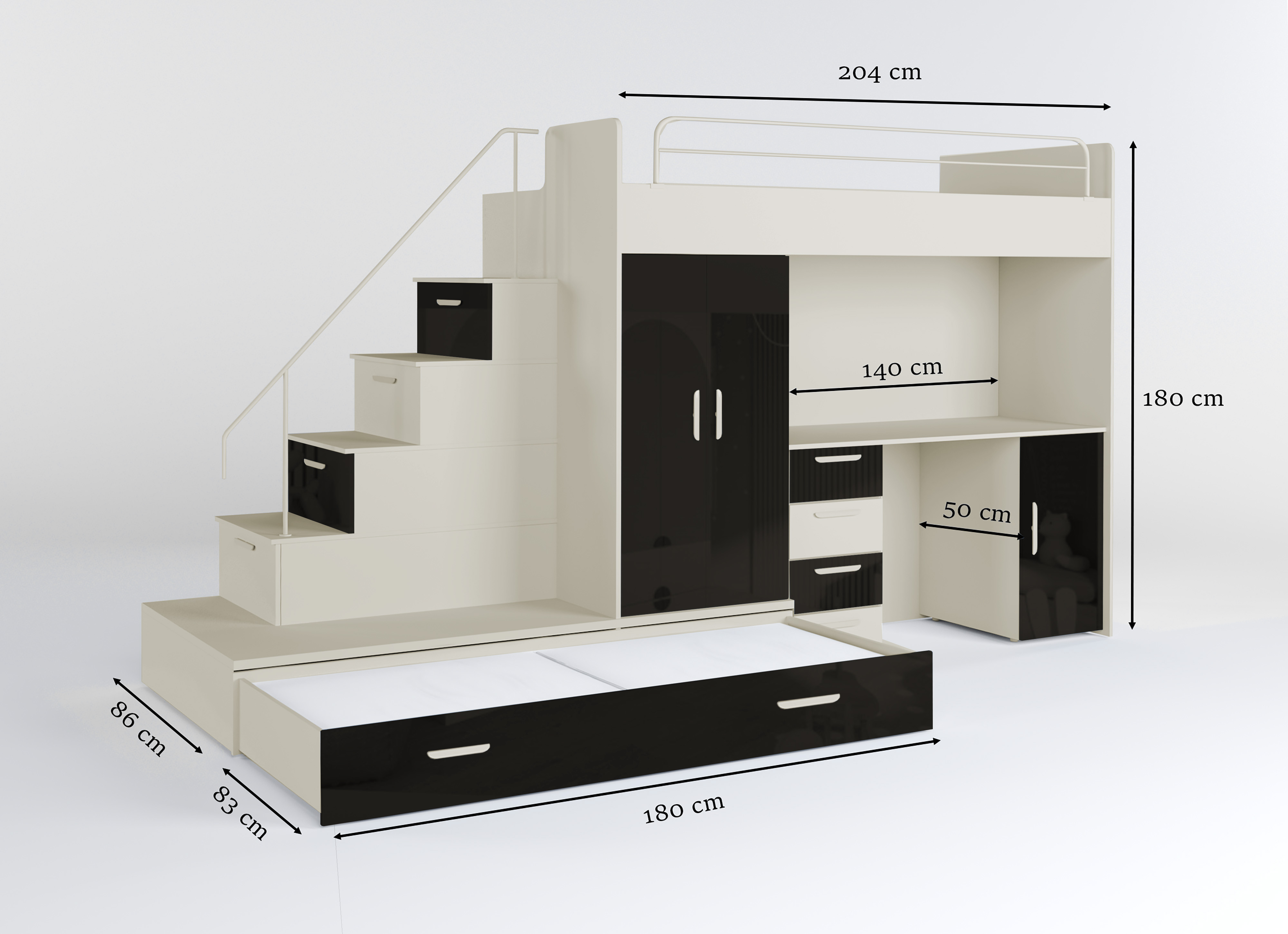 Detská posteľ Ruby V je veľmi praktický set do detskej izby, ktorý zahŕňa posteľ, PC stolík, skriňu a schody. Je ideálny aj do menších interiérov a je vyrobený z kvalitnej MDF dosky. Dvierka a zásuvky majú povrch z akrylovej lakovanej fólie s hrúbkou 0,8 mm. Posteľ má rozmery 180 x 204 x 86 cm, PC stolík 75,5 x 140 x 50 cm, skriňa 104 x 60 x 50 cm a schody - x 180 x 85 cm. Nosnosť postele je 80 kg a rošt je latový. Do tejto postele odporúčame použiť penový matrac s výškou 15 cm. Úložný priestor je zabezpečený skriňou a PC stolíkom a pri montáži je možné zvoliť pravé aj ľavé prevedenie. V cene nie sú zahrnuté doplnky, vankúše a dekorácie. Plocha spania je 80 x 200 cm.