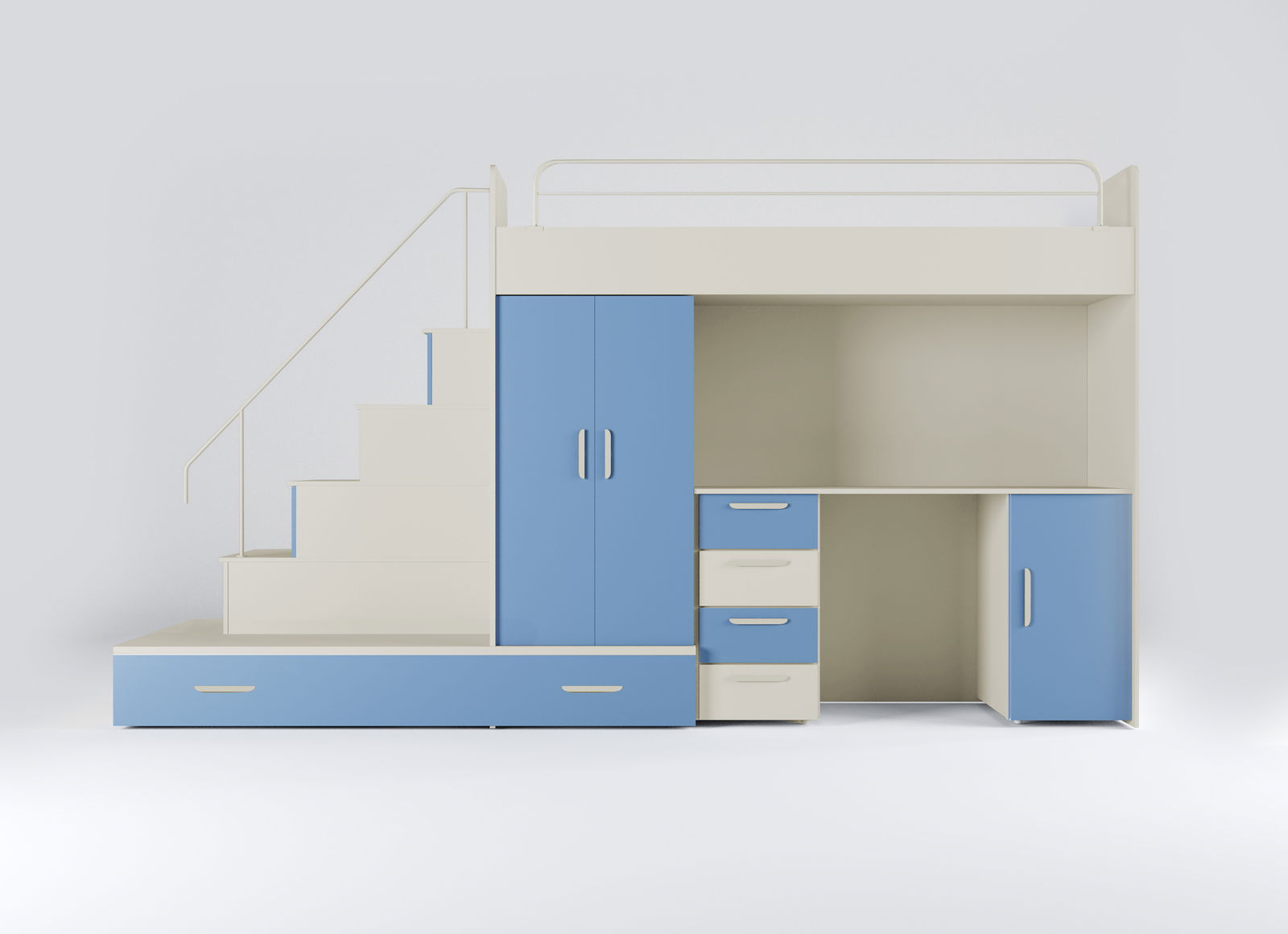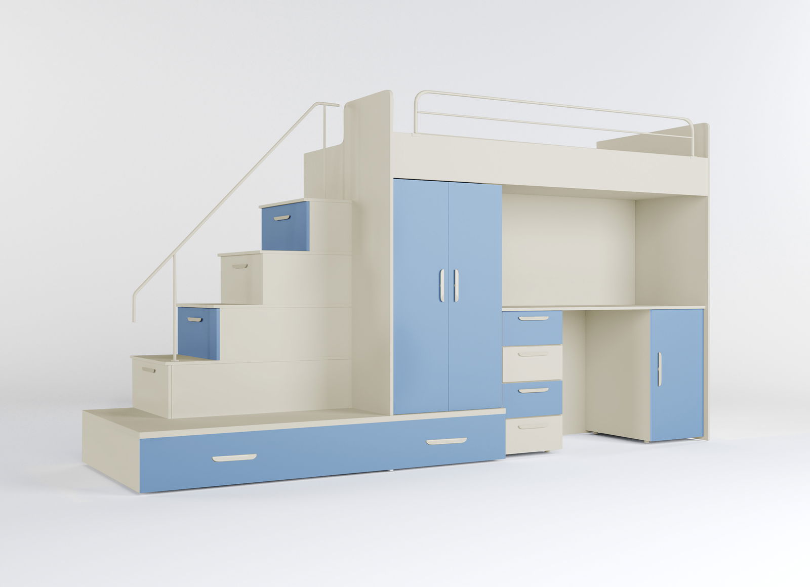 Detská posteľ Ruby V je veľmi praktický set do detskej izby, ktorý zahŕňa posteľ, PC stolík, skriňu a schody. Je ideálny aj do menších interiérov a je vyrobený z kvalitnej MDF dosky. Dvierka a zásuvky majú povrch z akrylovej lakovanej fólie s hrúbkou 0,8 mm. Posteľ má rozmery 180 x 204 x 86 cm, PC stolík 75,5 x 140 x 50 cm, skriňa 104 x 60 x 50 cm a schody - x 180 x 85 cm. Nosnosť postele je 80 kg a rošt je latový. Do tejto postele odporúčame použiť penový matrac s výškou 15 cm. Úložný priestor je zabezpečený skriňou a PC stolíkom a pri montáži je možné zvoliť pravé aj ľavé prevedenie. V cene nie sú zahrnuté doplnky, vankúše a dekorácie. Plocha spania je 80 x 200 cm.