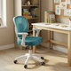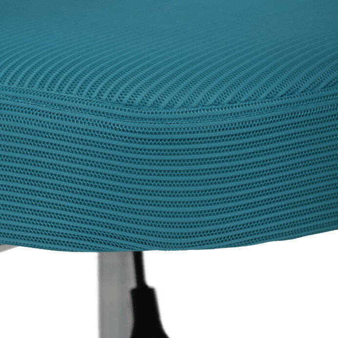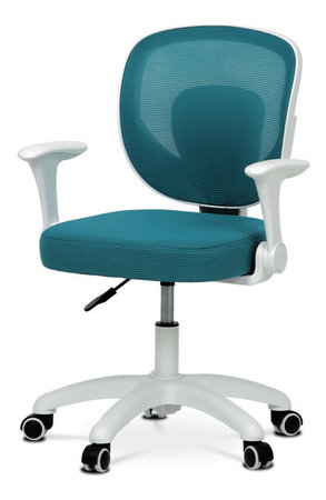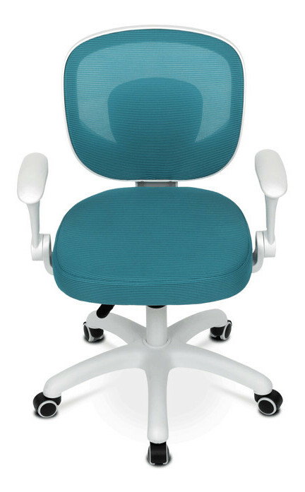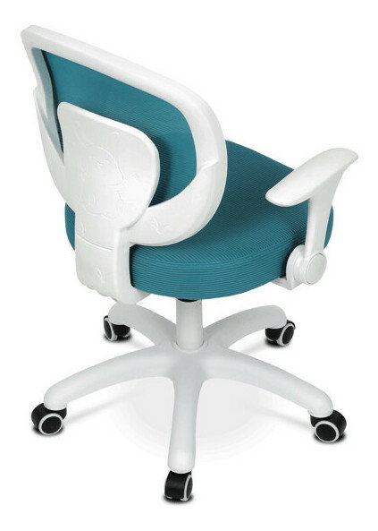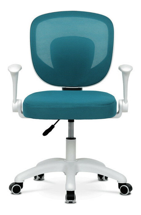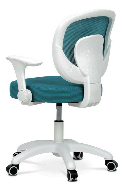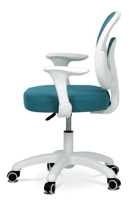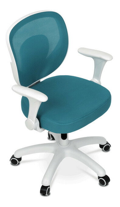 Detská stolička s modrým sieťovinovým poťahom ponúka priedušné a pohodlné sedenie vhodné pre mladších používateľov. Operadlo aj sedák sú potiahnuté jemnou sieťovinou, ktorá podporuje cirkuláciu vzduchu a prispieva k príjemnému pocitu počas dlhšieho sedenia. Odklápacie podrúčky z bieleho plastu umožňujú jednoduché prispôsobenie priestoru a lepšiu manipuláciu so stoličkou. Výškovo nastaviteľný mechanizmus umožňuje jednoduché prispôsobenie výšky sedáka podľa potreby dieťaťa. Stabilný plastový kríž je vybavený kolieskami určenými na tvrdé podlahy, čo zabezpečuje hladký pohyb a ochranu povrchu podlahy.