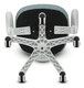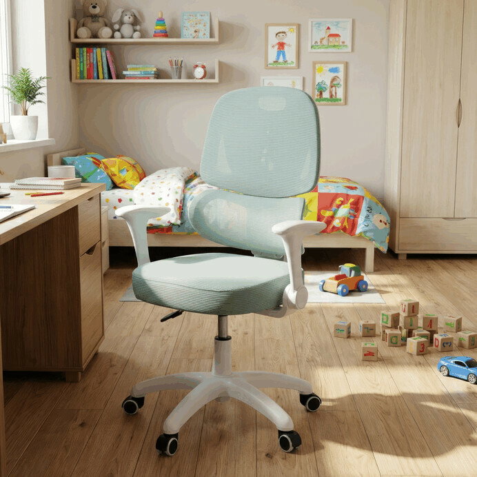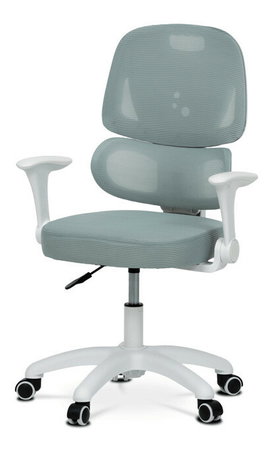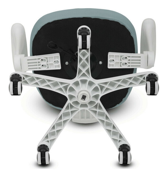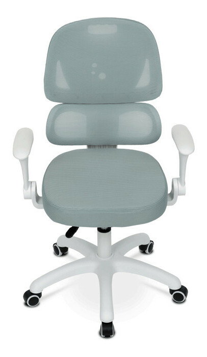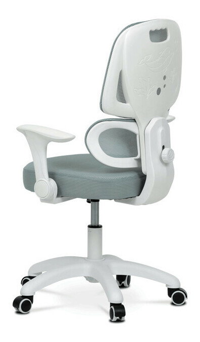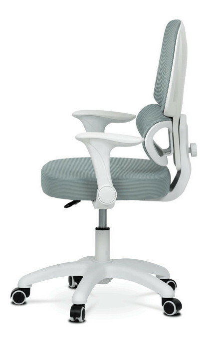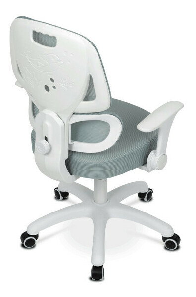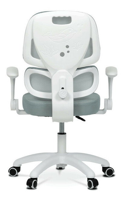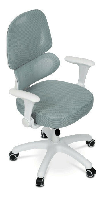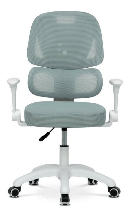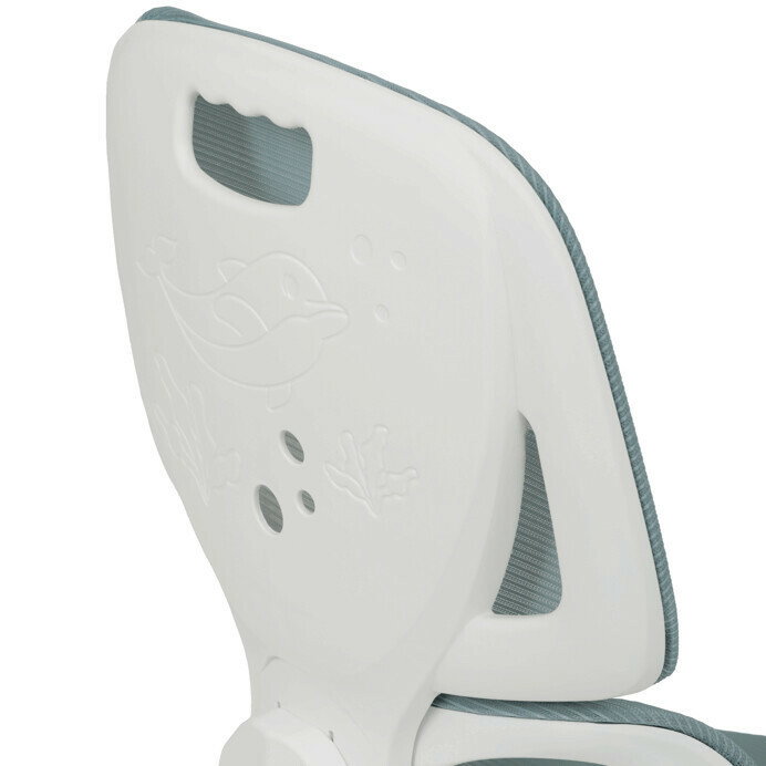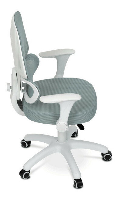 Detská stolička s konštrukciou z bieleho plastového kríža a kolieskami určenými na tvrdé podlahy ponúka stabilné a bezpečné sedenie. Operadlo aj sedák sú potiahnuté zelenou priedušnou sieťovinou, ktorá zabezpečuje komfortnú cirkuláciu vzduchu počas používania. Výškovo nastaviteľné operadlo a sedák umožňujú prispôsobenie stoličky aktuálnym potrebám dieťaťa, zatiaľ čo odklápacie podrúčky prispievajú k väčšej flexibilite a ľahkému prístupu k stolu. Integrovaná bedrová opierka podporuje správne držanie tela a prispieva k ergonómii sedenia. Vďaka týmto vlastnostiam je stolička vhodná na dlhodobé používanie v detskej izbe alebo pracovnom priestore.