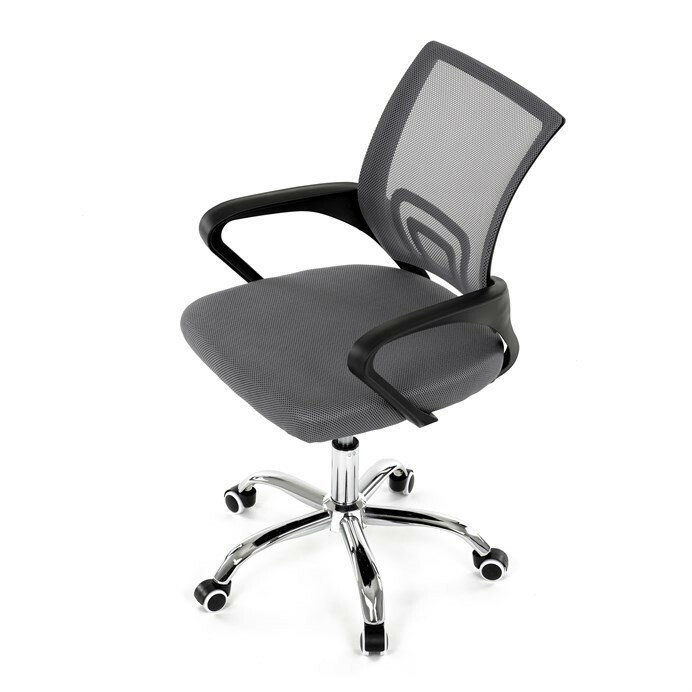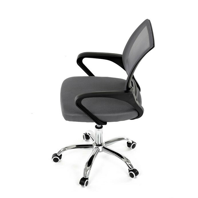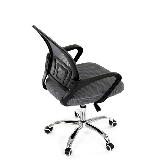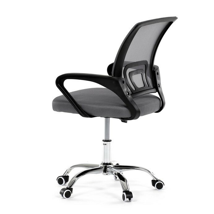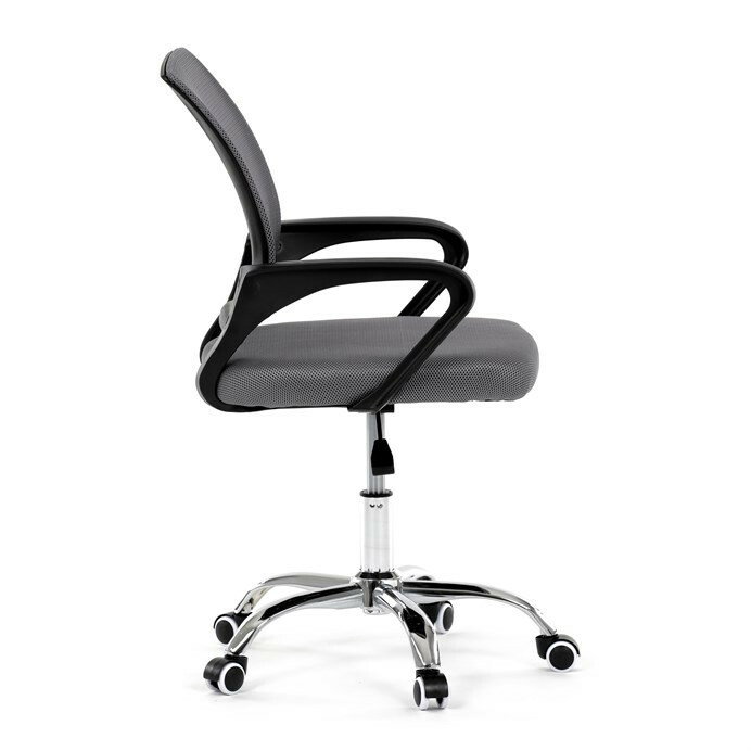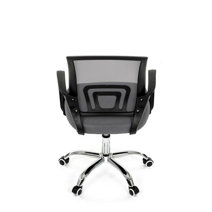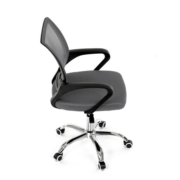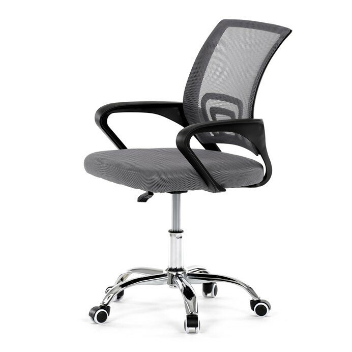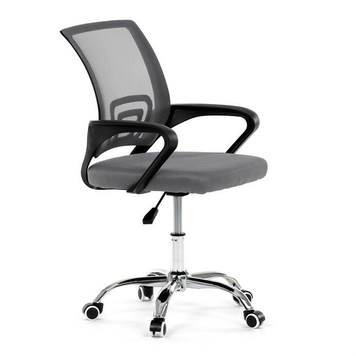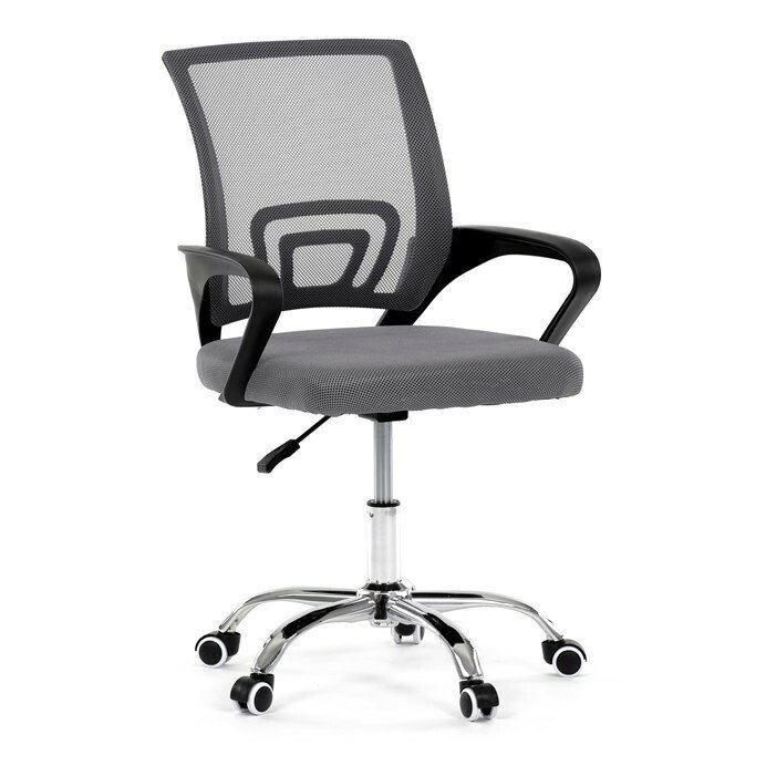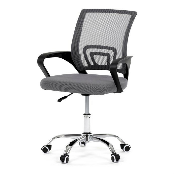 Moderná kancelárska stolička ponúka štýlový dizajn a pohodlie pre každodennú prácu. Operadlo je potiahnuté priedušnou sivou sieťovinou (mesh), ktorá zabezpečuje optimálnu ventiláciu a podporu chrbta. Pevné čierne plastové podrúčky poskytujú komfort pri sedení, zatiaľ čo stabilitu stoličky zaisťuje chrómový kríž s kolieskami pre ľahký pohyb. Vďaka kombinácii kvalitných materiálov a elegantného vzhľadu je ideálnou voľbou do kancelárie aj domácej pracovne.