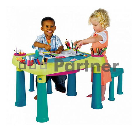 Multifunkčný stôl obsahuje všetko, čo je potrebné pre kreativitu Vášho dieťaťa. K dispozícii sú dve sedacie miesta. Stolček možno využívať vo vnútri domova, rovnako ako na terase alebo v záhrade. Vnútri stola sa nachádza úložný priestor, ktorý umožňuje úhľadné usporiadanie pracovného priestoru. Vyrobené z vysoko odolného plastu so stabilnou konštrukciou. Garantuje funkčnosť po niekoľko rokov.