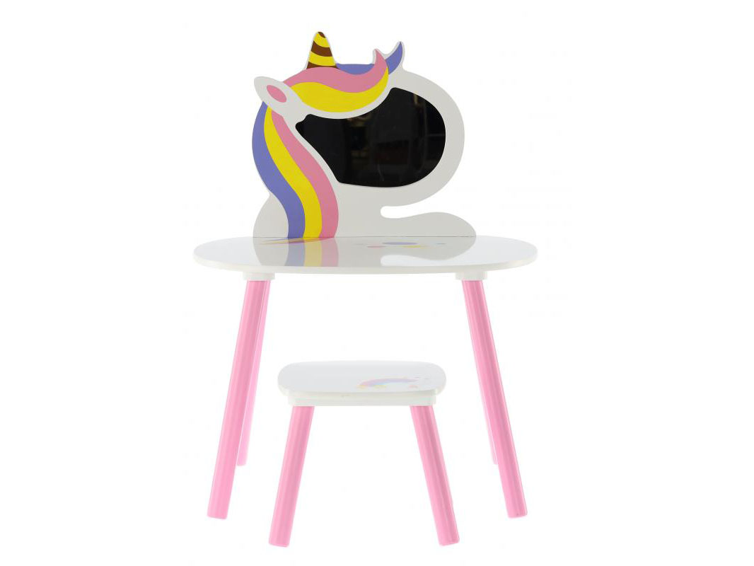 Detský toaletný stolík s taburetkou Chomik - Lillyann (biela + ružová) je ideálnym doplnkom do detskej izby pre každú malú princeznú. Toaletný stolík s čarovným jednorožcom je vyrobený z borovicového dreva a MDF, má zrkadlo v tvare jednorožca a prislúcha k nemu aj taburetka. Rozmery stolíka sú 80 cm výška, 44 cm šírka a 40 cm hĺbka, zatiaľ čo taburetka má rozmery 28x28x27 cm. Stolík je dokonalým riešením pre malé dámy, ktoré sa radi obliekajú a líčia, a navyše môže slúžiť aj ako zaujímavá dekorácia.