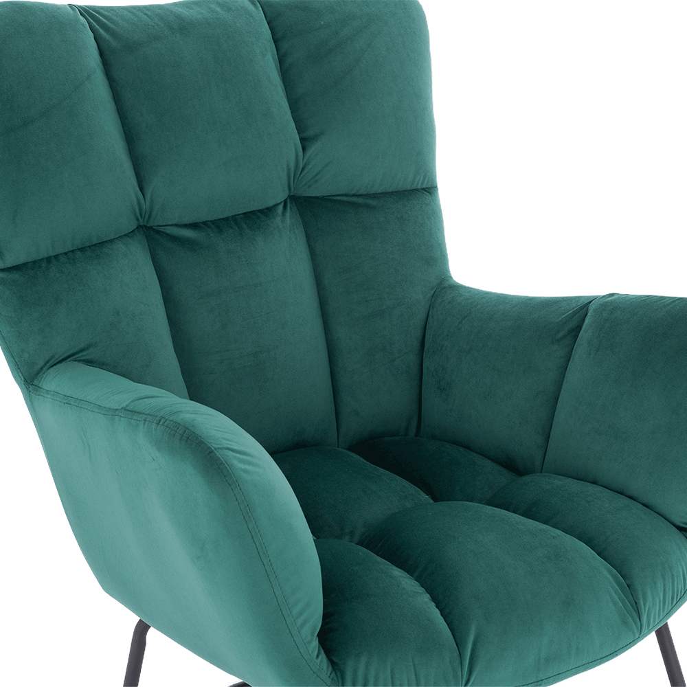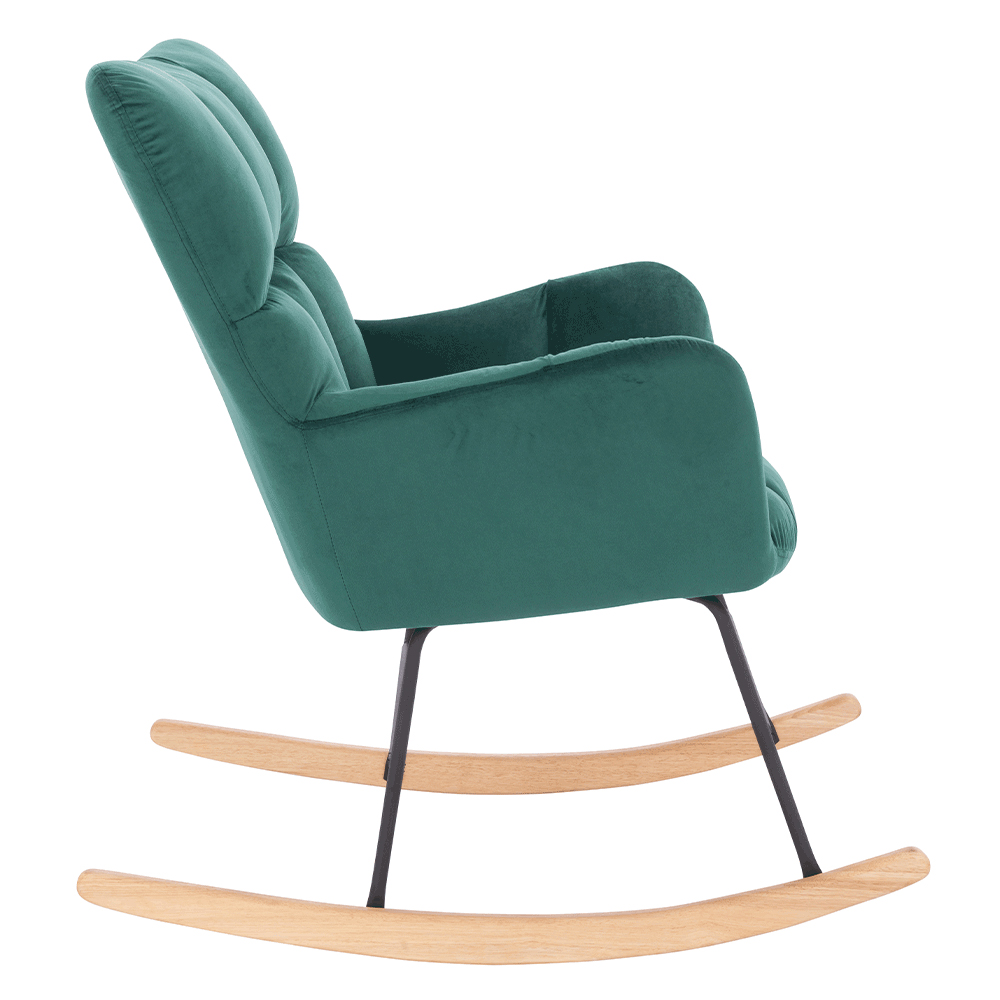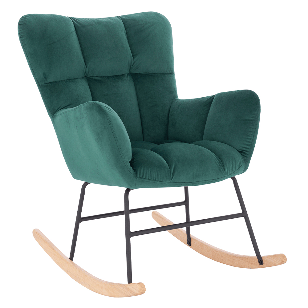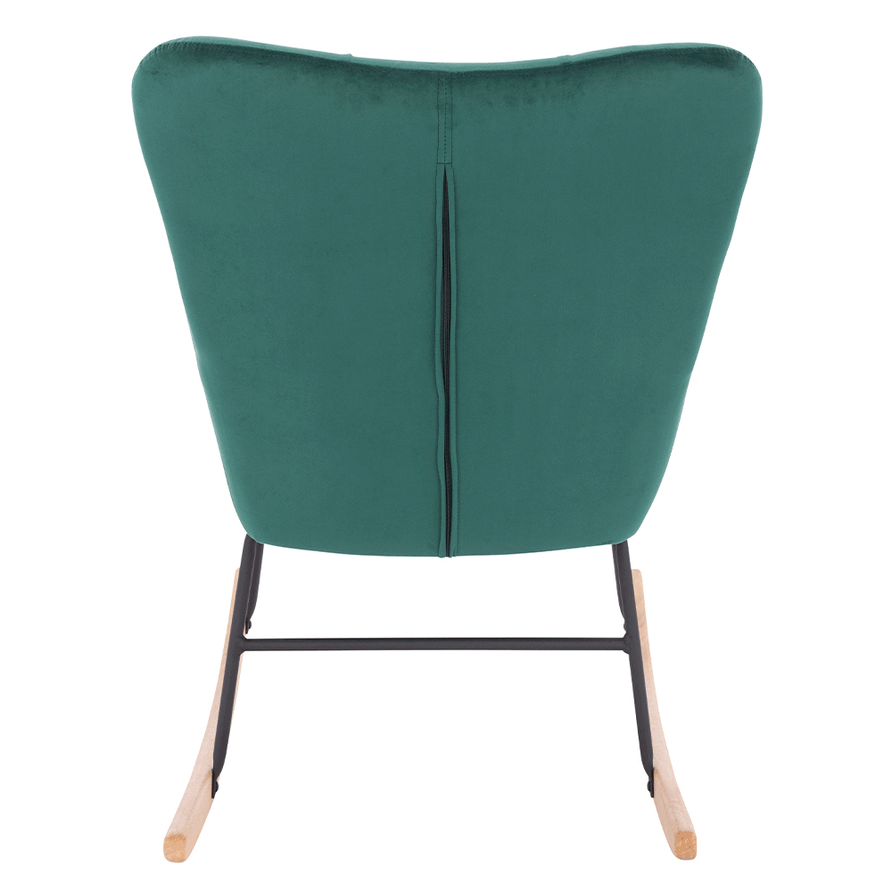 Dizajnové hojdacie kreslo Kerem v smaragdovej farbe s výškou 96 cm, šírkou 58 cm a hĺbkou 89 cm ponúka moderný a pohodlný spôsob relaxácie. Konštrukcia je vyrobená z pevného a stabilného kovového materiálu v čiernej farbe a časti, ktoré zaručujú hojdanie sú z dreva v prírodnom prevedení. Kreslo má extra nadýchané sedadlo a operadlo, s dostatočne vysokou chrbtovou opierkou a praktickými opierkami pre ruky. Výška sedadla je 45 cm, hĺbka sedadla 47 cm a šírka sedadla 40 cm. Výška opierky je 52 cm, šírka opierky 55 cm a výška od podlahy po spodnú časť sedadla je 35 cm. Kreslo má nosnosť 100 kg a je čalúnené. K dispozícii sú aj iné farebné prevedenia.