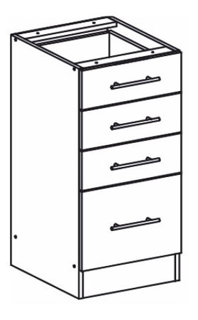 Dolná kuchynská skrinka so zásuvkami. Vybavená je 4 zásuvkami. Spodná zásuvka je hlbšia. Dodávaná bez hornej pracovnej dosky, ktorú si však môžete prikúpiť v našom obchode.