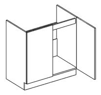 Dolná kuchynská skrinka na zabudovanie drezu s dvomi dvierkami. Skrinka nemá zadnú dosku kvôli odpadovým rúram.