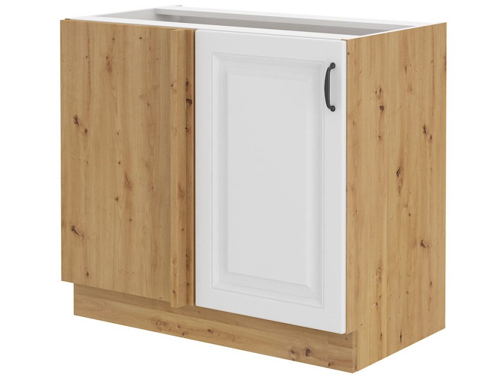 Dolná kuchynská skrinka Sheila 105 ND 1F BB (dub artisan + biela) je dvojdverová skrinka z kuchynského sektorového systému v modernom štýle. Materiál skrinky je drevotrieska laminovaná, korpus je z dubu Artisan a predná doska je biela matná z MDF dosky. Skrinka má kovové úchyty a systém tichého zatvárania. Dvierka sú univerzálne a možno ich namontovať na ľavej aj pravej strane. Skrinka má biely interiér a zlepé vyvŕtané otvory pre rukoväť. Pracovná doska nie je súčasťou ceny.