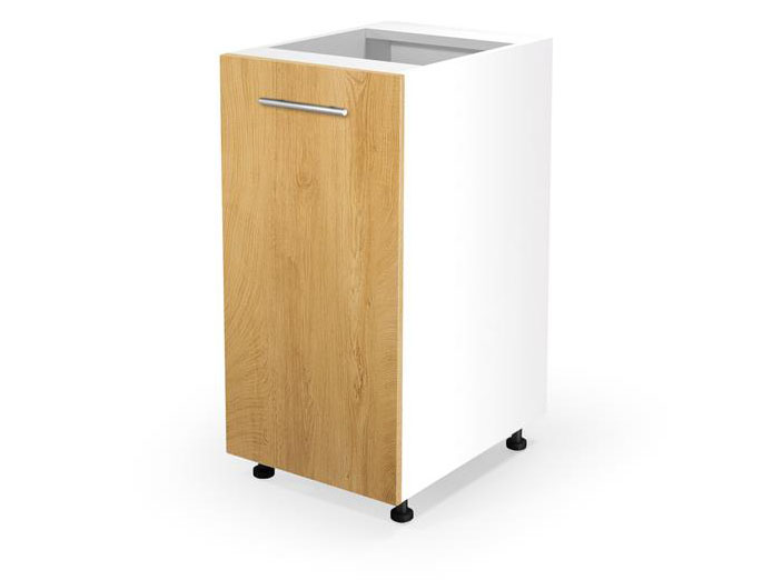 Dolná kuchynská skrinka Verlene s prirodzeným dreveným vzhľadom a bielymi prvkami je vyrobená z laminovanej drevotriesky a MDF. Je vybavená rukoväťou a ponúka dostatok úložného priestoru. Rozmery skrinky sú výška 82 cm, šírka 40 cm a hĺbka 52 cm. Súčasťou sú päť balíkov s rôznymi rozmermi.