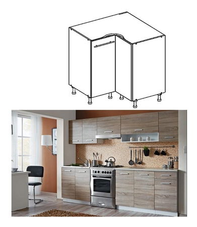 Dolná rohová kuchynská skrinka Hariva DN-90 (dub sonoma + biela) výška 84 cm, šírka 88 cm, hĺbka 88 cm, je praktickým doplnkom pre každú kuchyňu. Skrinka je vyrobená z kvalitného materiálu - laminovaného dreva a má moderný dizajn v kombinácii farieb dub sonoma a biela. Vnútri má dostatok miesta na uloženie nádobí a kuchynských potrieb. Jednoducho sa inštaluje a je odolná voči poškodeniu a vlhkosti. Vďaka svojim rohovým rozmerom dokonale využije priestor v kuchyni. Skrinka Hariva DN-90 je ideálnym riešením pre každého, kto hľadá funkčný a zároveň esteticky príjemný nábytok do svojej kuchyne.