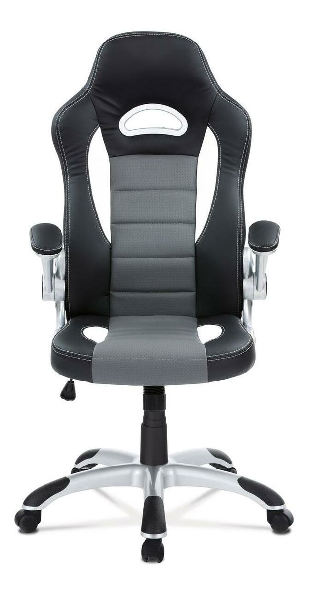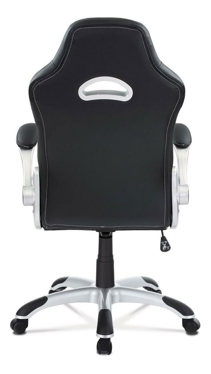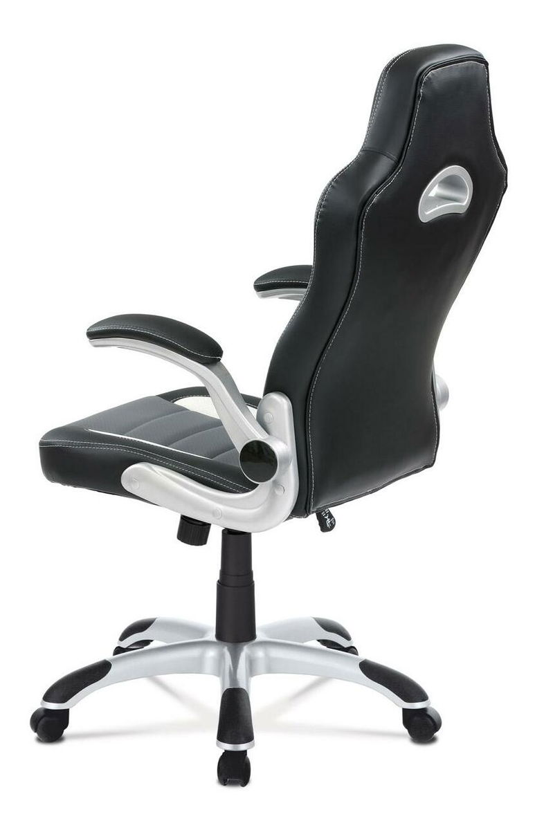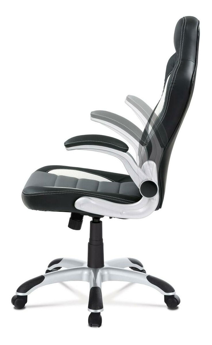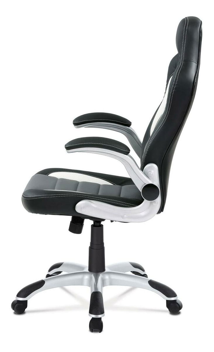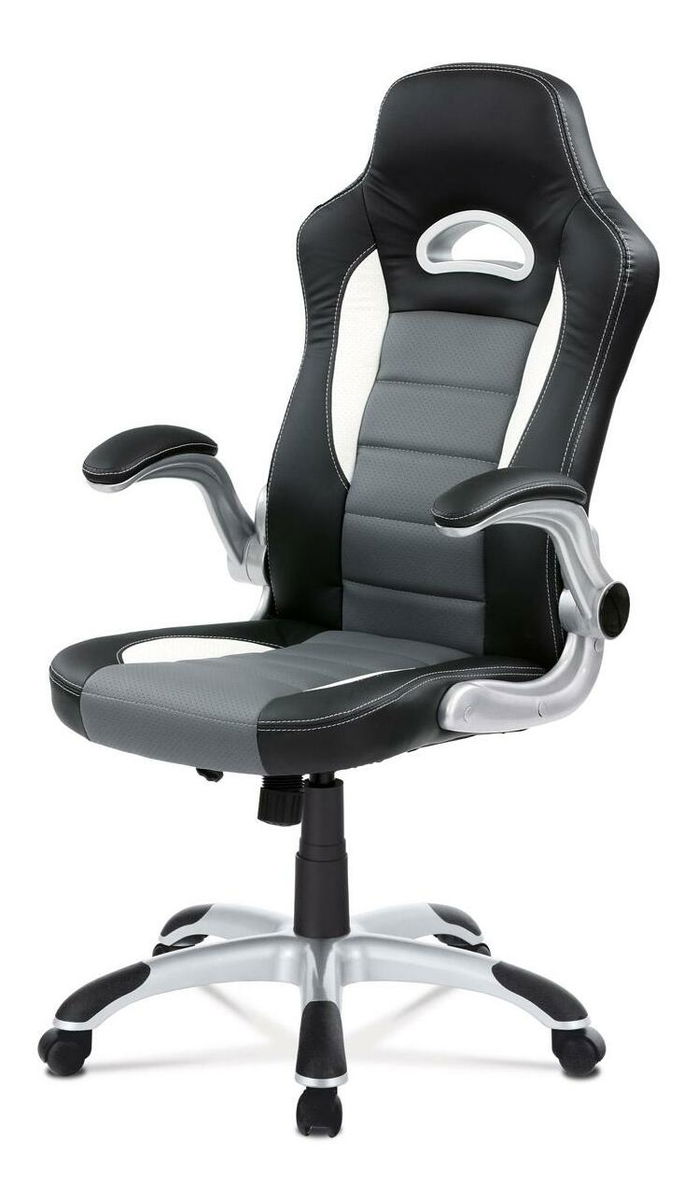 ZobraziťVeľmi populárny model športového kancelárskeho kresla v dizajne sedačky závodného vozidla a zaoblenými líniami. Má skvelé ergonomické rozvrhnutie. Poťah je kombináciou čiernej, bielej a šedej ekokože s bielym prešívaním. Polstrovanie je z kvalitnej PU peny je zárukou pohodlného posedenia pri herných večeroch. Ruky si môžete pohodlne položiť na odklápacie polstrované podrúčky potiahnuté čiernou ekokožou a samozrejme s bielym obšitím. Kreslo je vybavené hojdacím mechanizmom. Sila hojdania sa reguluje plastovou skrutkou pod sedákom. Výška sedenia sa upravuje páčkou na pravej strane cez kvalitný plynový piest. Masívny strieborný plastový kríž s čiernymi protišmykovými doplnkami je osadený plastovými kolieskami na koberec. Šírka podrúčky je 8 cm, výška 70 - 80 cm. Nosnosť stoličky je 120 kg.