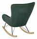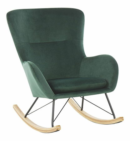 Kombinácia komfortu a štýlu. Toto hojdacie kreslo inšpirované štýlom glamour dokonale doplní moderný či klasický interiér. Zelené zamatové čalúnenie je odolné a nenáročné na údržbu. Sedadlo je postavené na pevnej konštrukcii s drevenými spodnými časťami, ktoré zaručujú príjemné hojdanie. Vďaka hrubej a mäkkej výplni výborne poslúži ako kreslo pri krbe alebo v detskej izbe.