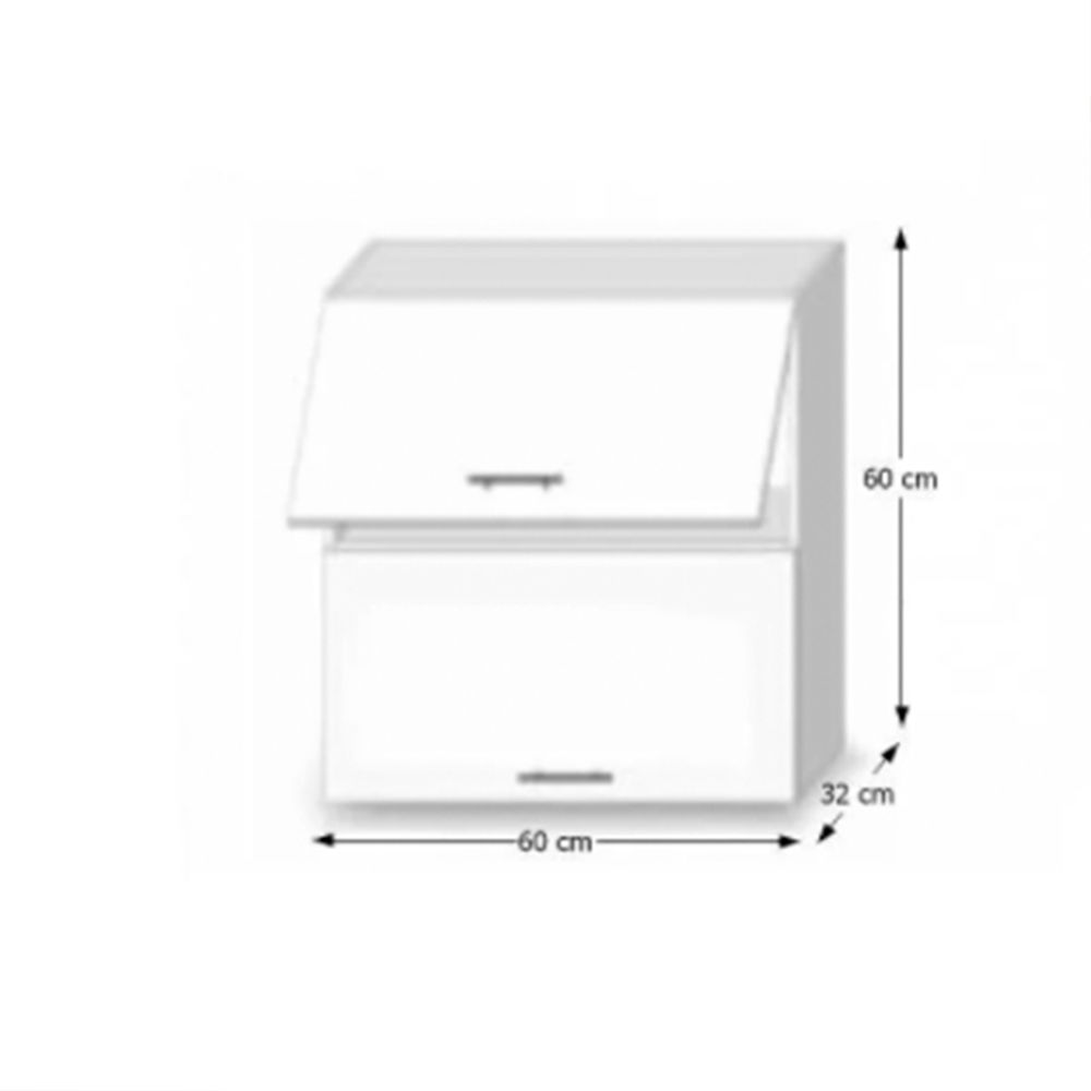 Horná kuchynská skrinka má rozmery 60 cm na výšku, 60 cm na šírku a 32 cm na hĺbku. Dvere sú vybavené kvalitnými kovovými pantmi a modernými kovovými madlami v sivom odtieni. Skrinka poskytuje dostatok úložného priestoru pre rôzne kuchynské potreby a jej dizajn dokonale doplní modernú kuchyňu.