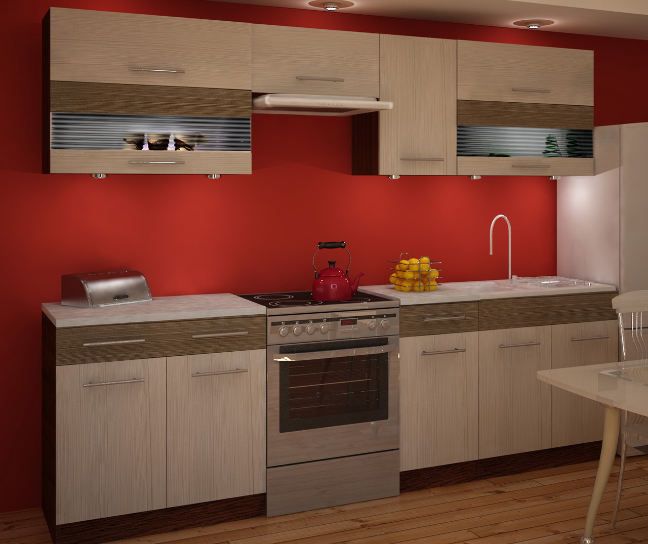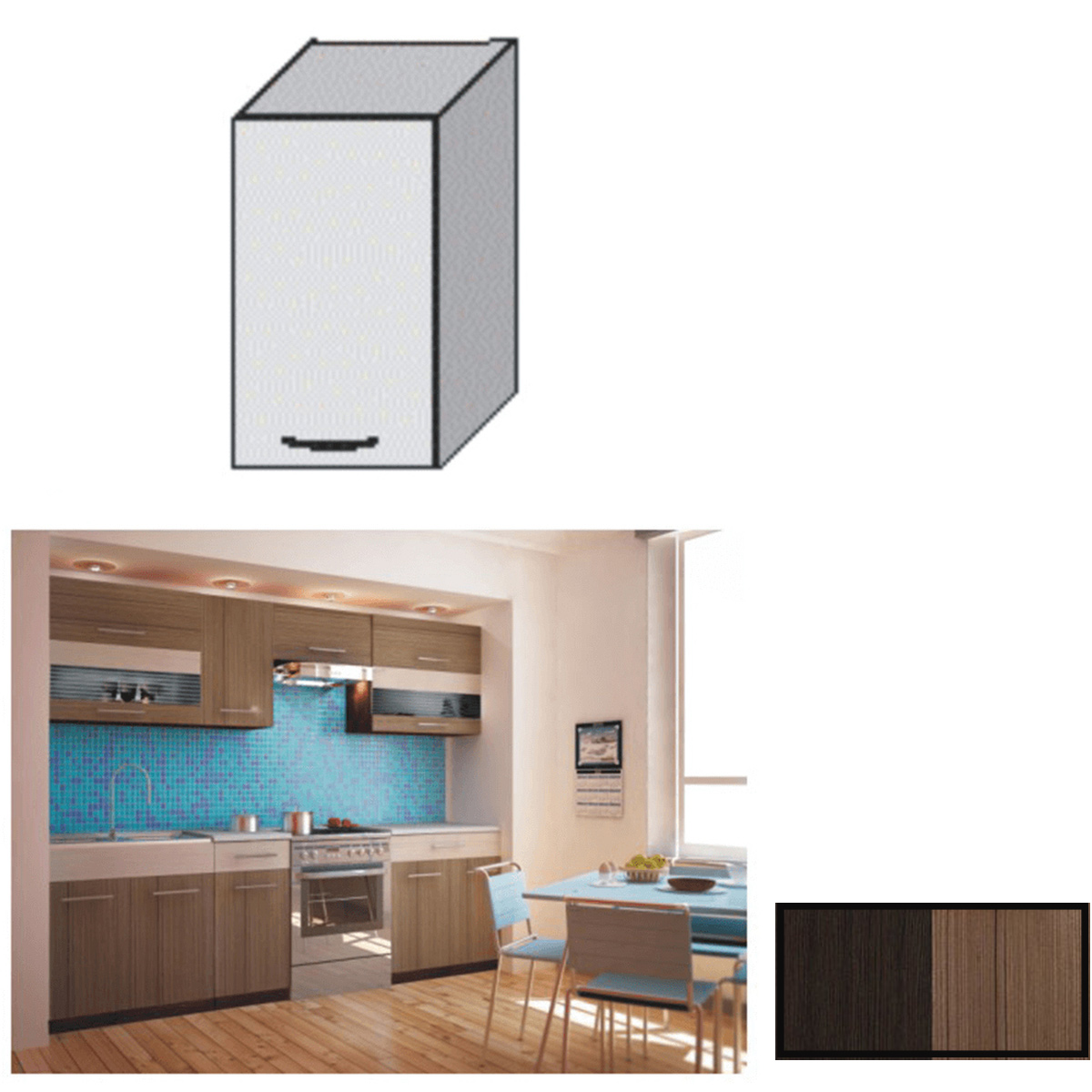 Prichádza v troch farebných prevedeniach. Korpus je vždy vo farbe dreva wenge, pričom sa mení farebnosť dvierok. Pri prvom type prevláda farba dreva Rigolletto dark, doplnená o Rigolletto light. Druhý typ má túto kombináciu obrátene. Pri treťom type prevláda farba dreva wenge v kombinácii s bielou, doplnená o farbu korpusu dreva wenge. Materiál použitý na výrobu je laminovaná DTD.