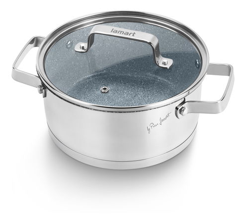 Hrniec s pokrievkouVyrobený z prvotriednej nehrdzavejúcej oceleVybavený silným sendvičovým dnom a veľmi elegantnými rukoväťami pre väčšiu bezpečnosť, funkčnosť a pohodlieVnútorný marble povrch odolný proti oderu a pripáleniuNepriľnavý marble materiál bez použitia PFOA (nevyparujú sa žiadne toxické látky pri prehriatí), teplotne vysoko odolný, zabraňuje pripáleniu, Ideálne pre zdravé vareniePokrievka z odolného skla a otvorom pre paru pre dokonalú kontrolu vareniaVhodné pre všetky typy sporákovVhodné do umývačky riaduJednoduchá údržba a čistenie3 roky zárukaMateriál: nerezFarba: šedáObjem: 1,3 lRozmer: 16cm, výška 7,5cm
