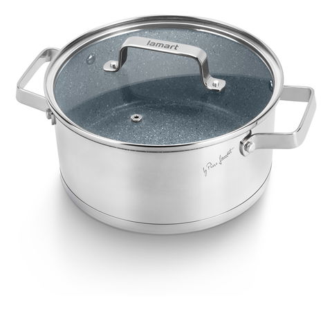 Hrniec s pokrievkouVyrobený z prvotriednej nehrdzavejúcej ocele, vybavené silným sendvičovým dnom a veľmi elegantnými rukoväťami pre väčšiu bezpečnosť, funkčnosť a pohodlieVnútorný marble povrch odolný proti oderu a pripáleniuNepriľnavý marble materiál bez použitia PFOA (nevyparujú sa žiadne toxické látky pri prehriatí), teplotne vysoko odolný, zabraňuje pripáleniu, Ideálne pre zdravé vareniePokrievka z odolného skla a otvorom pre paru pre dokonalú kontrolu vareniaVhodné pre všetky typy sporákovVhodné do umývačky riaduJednoduchá údržba a čistenie3 roky zárukaMateriál: nerezFarba: šedáObjem: 2,7lRozmery: 20cm, výška 9,5cm