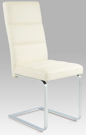 Jedálenská stolička s kovovými nožičkami v prevedení chrómová farba, koženka vo farbe krémovej je použitá na čalúnení masívnejšieho operadla a sedáku.