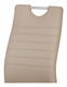 Moderná jedálenská stolička s dekoratívne prešitým operadlom je očalúnená koženkou vo farbe cappuccino. Pochrómované madlo a pohupová podnož sú kruhového prierezu. Vďaka ľahkému prehnutiu podnože dochádza k posunutiu ťažiska stoličky viac dozadu, čím je stolička menej náchylná na preklopenie dopredu. Ľahké prehnutie tiež plní estetickú funkciu, pretože sa jedná o dizajn vskutku menej tradičný. Vďaka praktickému madlu je manipulácia so stoličkou jednoduchá, rovnako ako údržba je bezproblémovou záležitosťou. Nosnosť do 110 kg.