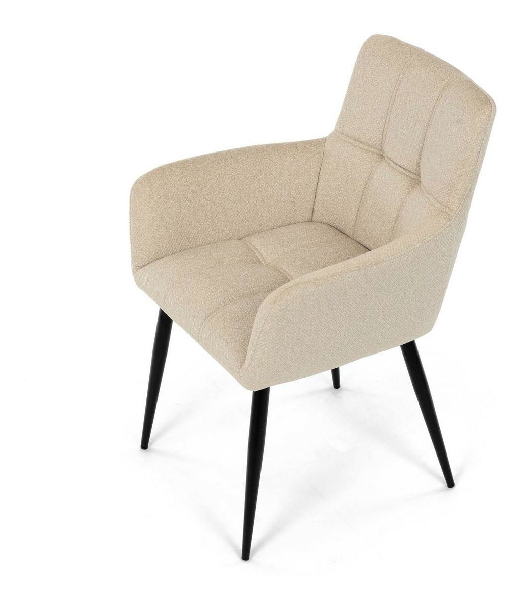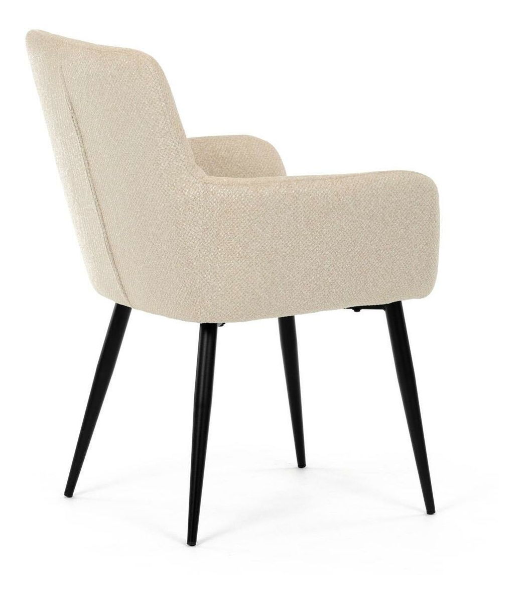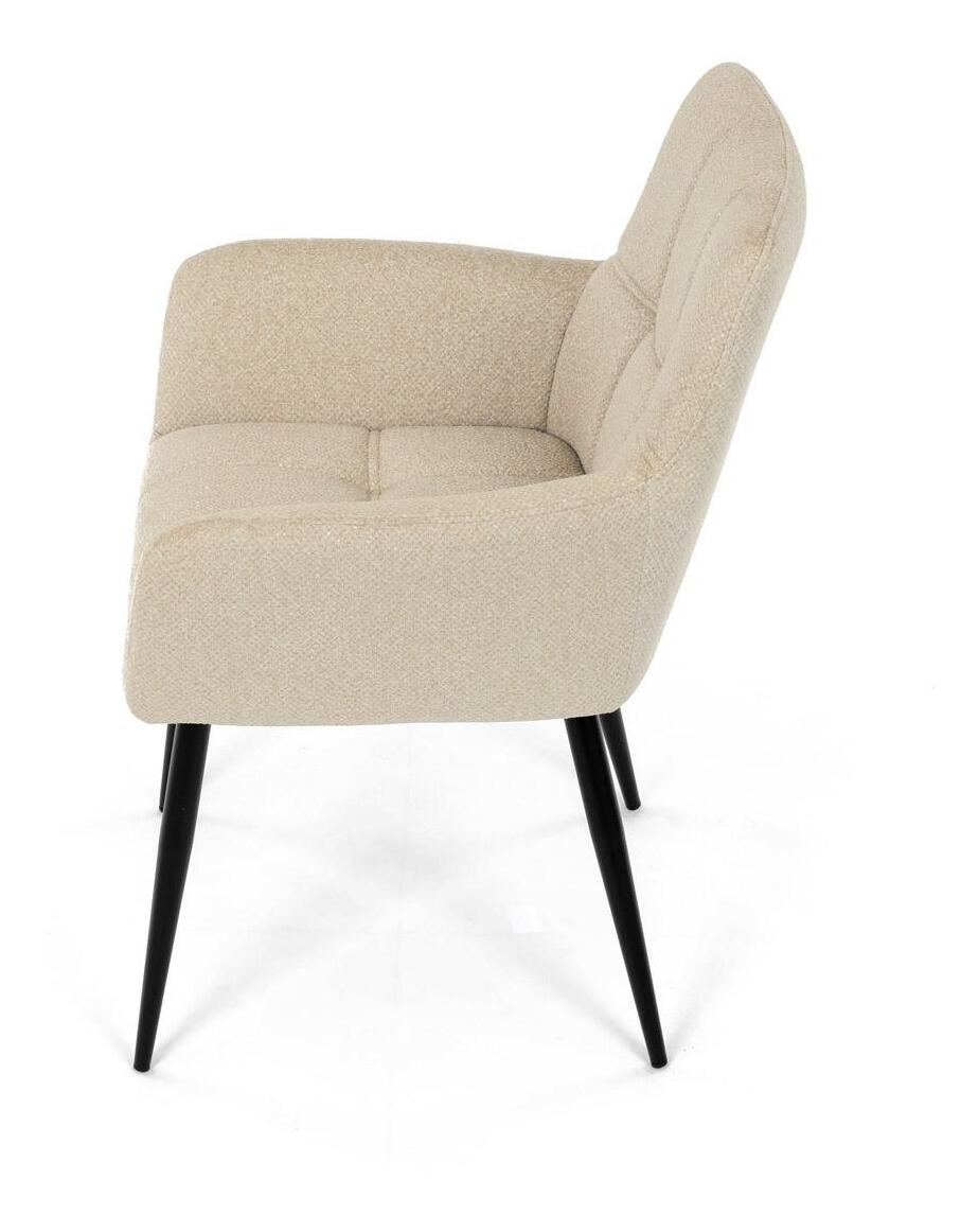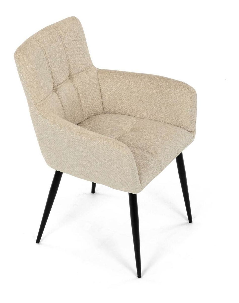 Elegantná krémová jedálenská stolička skvele doplní moderné aj klasické interiéry. Táto štýlová stolička ponúka vysoký komfort vďaka čalúneniu z kvalitnej látky a mäkkému sedáku z PU peny. Čierne kovové nohy zaisťujú stabilitu a dodávajú stoličke jemný industriálny nádych. Komfortné podrúčky a ergonomické prevedenie oceníte pri každom posedení. Stolička sa hodí nielen do domácej jedálne, ale aj do reštauračných priestorov, kde vytvorí útulnú atmosféru.