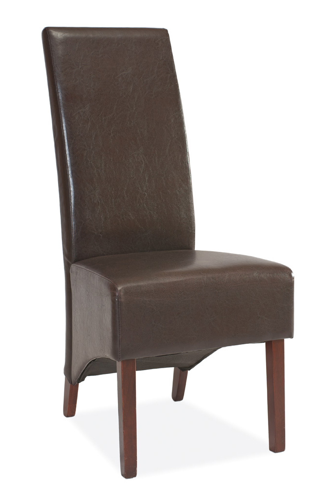 Masívna stolička Donadoni v hnedom farebnom prevedení pôsobí robuste, ale elegantne zároveň. Stolička je celá potiahnutá koženkou v hnedej farbe, nohy stoličky sú vo farbe orechového dreva.