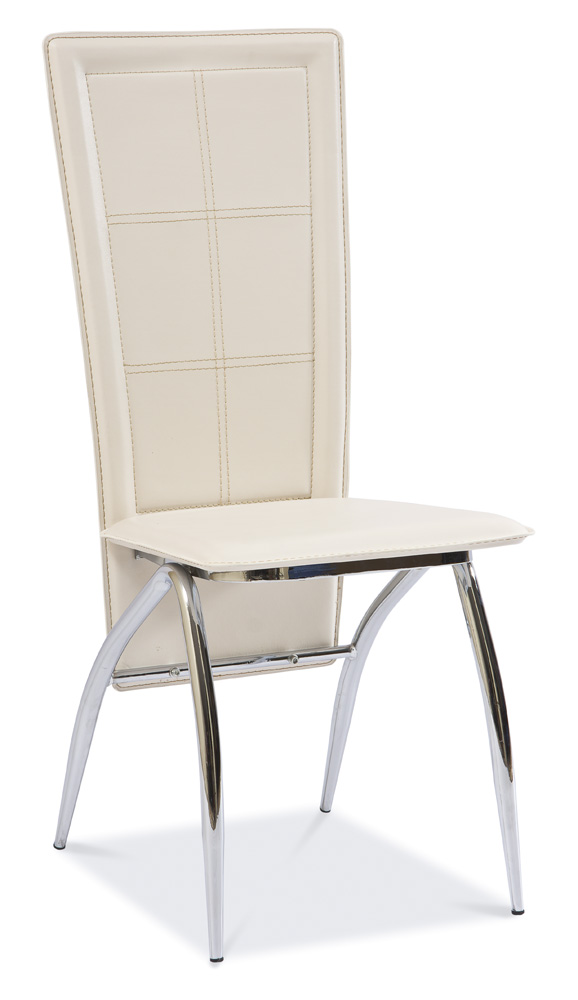 Dizajnová stolička H-140 má zaujímavo riešené operadlo, ktoré je ukončené o niečo nižšie ako pri ostatných stoličkách. Stolička je potiahnutá koženkou v krémovom farebnom prevedení a rám stoličky je z kovu v prevedení chrómu.