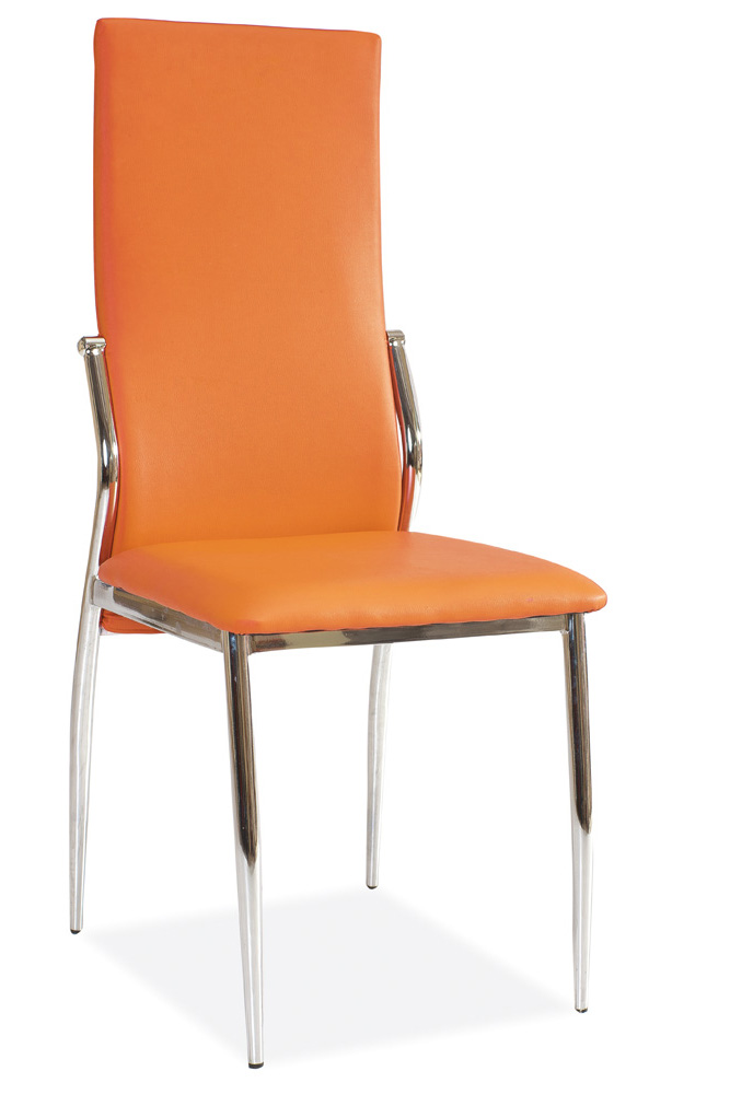 Pekná stolička H-237 s netradičným dizajnovým prvkami od značky Signal. Stolička je potiahnutá koženkou v oranžovom farebnom prevedení, netradične je riešená konštrukcia zadných nôh, ktorá je potiahnutá približne do polovice operadla.
