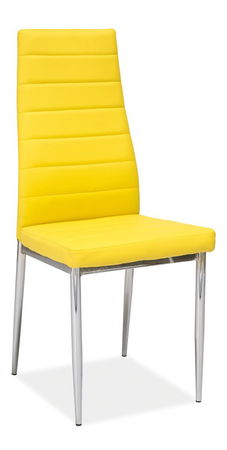Elegantná čalúnená stolička s predĺženým operadlom pre pohodlné sedenie. Kovová konštrukcia je pochromovaná. Čalúnenie je vyrobené z ekokože žltej farby. Stolička sa hodí do jedální, kancelárií či zasadacích miestností.