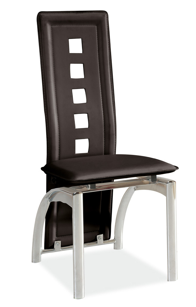 Moderná stolička H-77 má zaujímavé dizajnové prvky. Operadlo stoličky je ukončené až tesne nad zemou a v operadle sú aj malé výrezy v podobe štvorcov. Stolička je v čiernom farebnom prevedení a je potiahnutá koženkou. Kovová konštrukcia je vo farebnom prevedení chrómu.