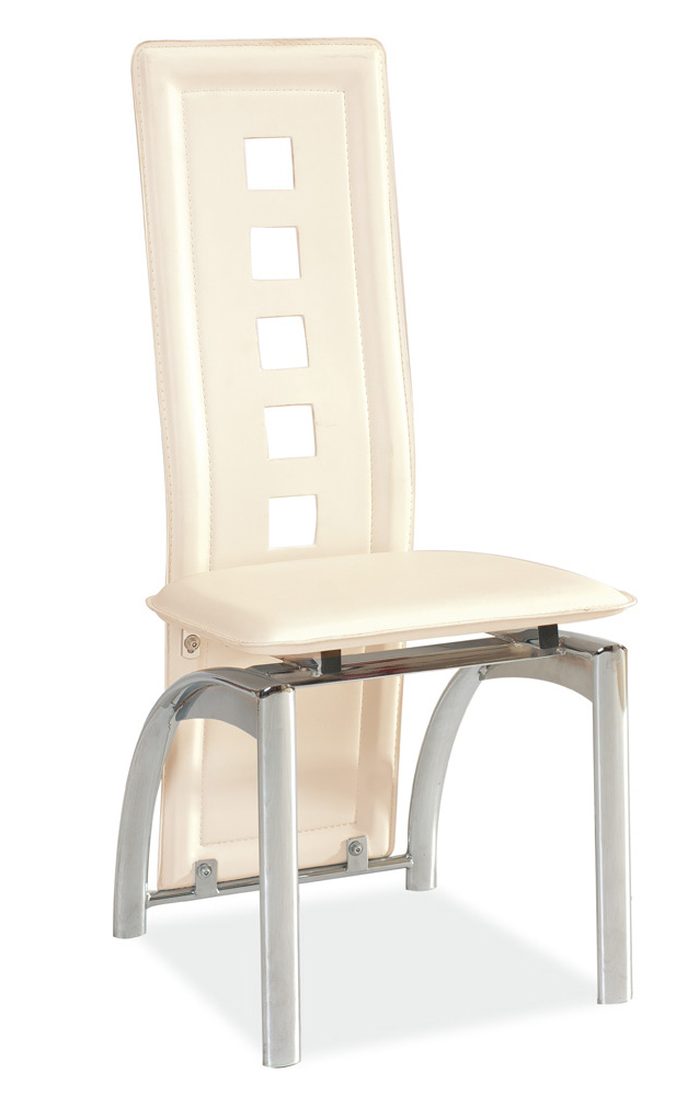 Moderná stolička H-77 má zaujímavé dizajnové prvky. Operadlo stoličky je ukončené až tesne nad zemou a v operadle sú aj malé výrezy v podobe štvorcov. Stolička je v krémovom farebnom prevedení a je potiahnutá koženkou. Kovová konštrukcia je vo farebnom prevedení chrómu.