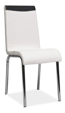 Táto elegantná stolička H-161 vhodná do jedálne či kuchyne je charakteristická sedákom, ktorý je potiahnutý trošku nižšie ako býva zvykom. Stolička je potiahnutá bielou elegantnou koženkou s kovovým rámom vo farbe chrómu. Jemný pásik čiernej farby na vrchnej časti operadla veľmi pekne dotvára celkový elegantný vzhľad stoličky.