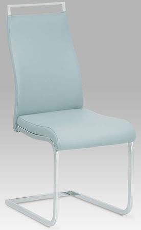 Moderná jedálenská stolička. Chrómové nohy (oceľové), sedák s operadlom sú čalúnené koženkou šedej farby, výrazný držiak na hornej časti opierky na chrbát.