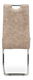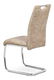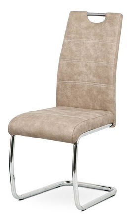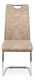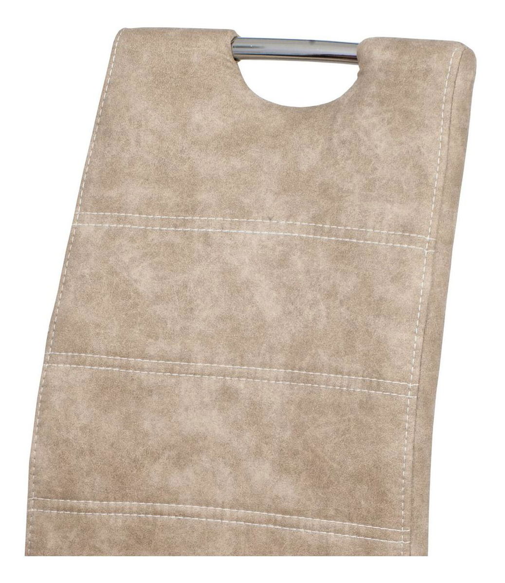 ZobraziťJedálenská stolička v modernom štýle. Poťah krémová látka COWBOY v dekore vintage kože, s bielym horizontálnym prešitím sedadla a operadla. Kovová pohupová chrómovaná podnož. Nohy sú kruhového prierezu a ukončené plastovými klzákmi. Nosnosť stoličky je 110 kg.