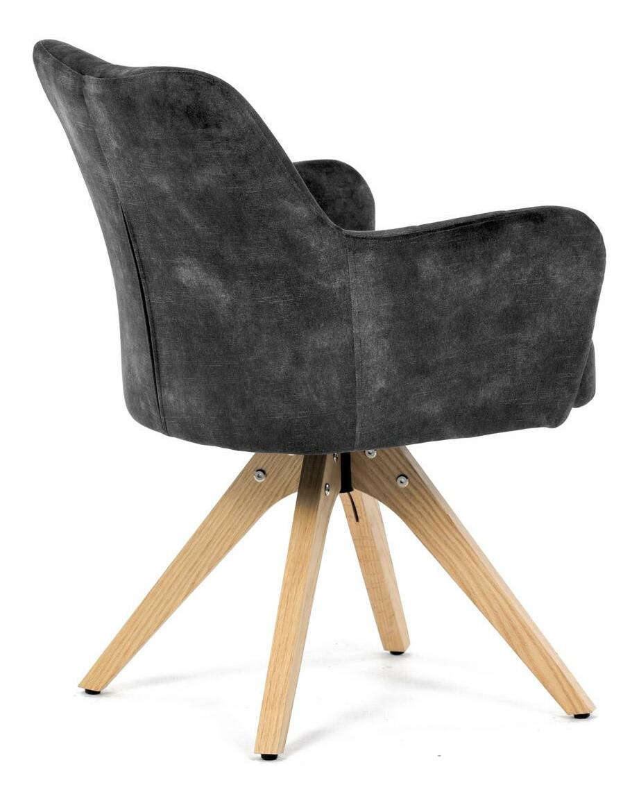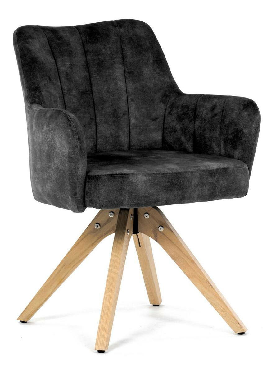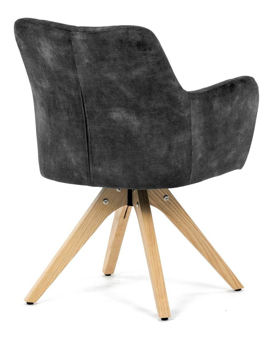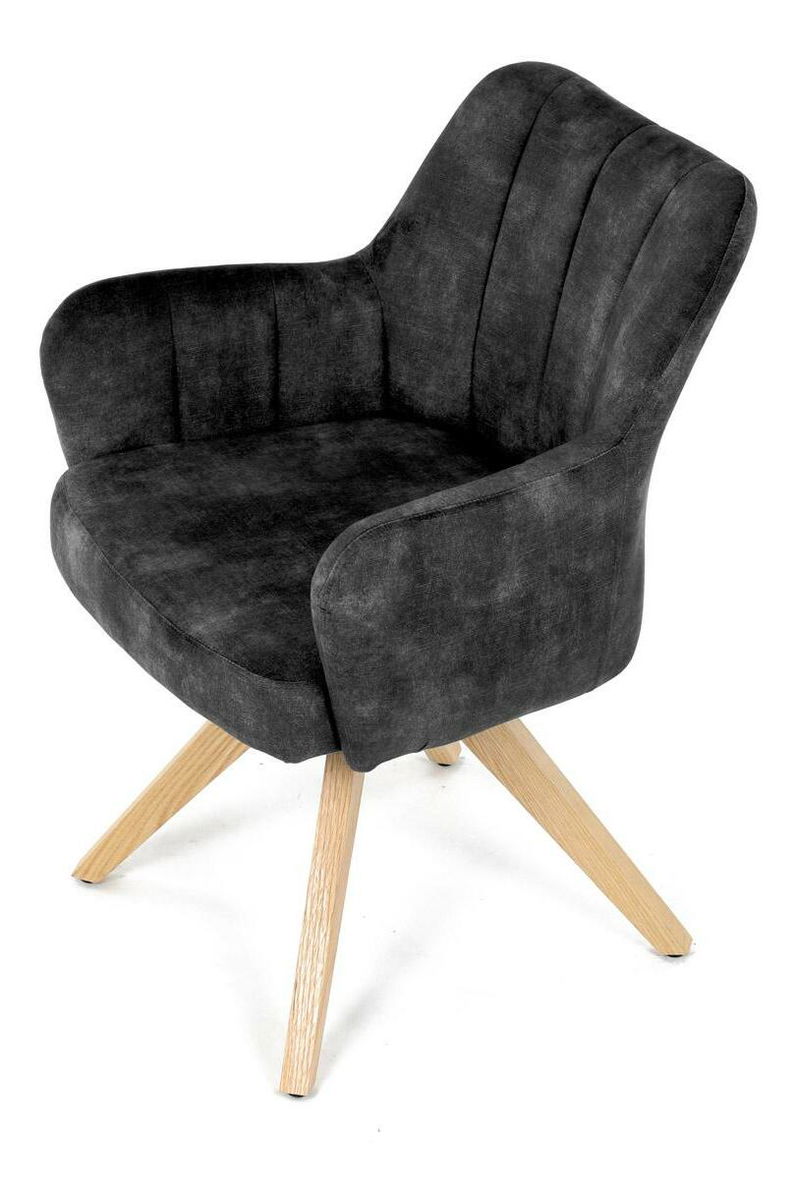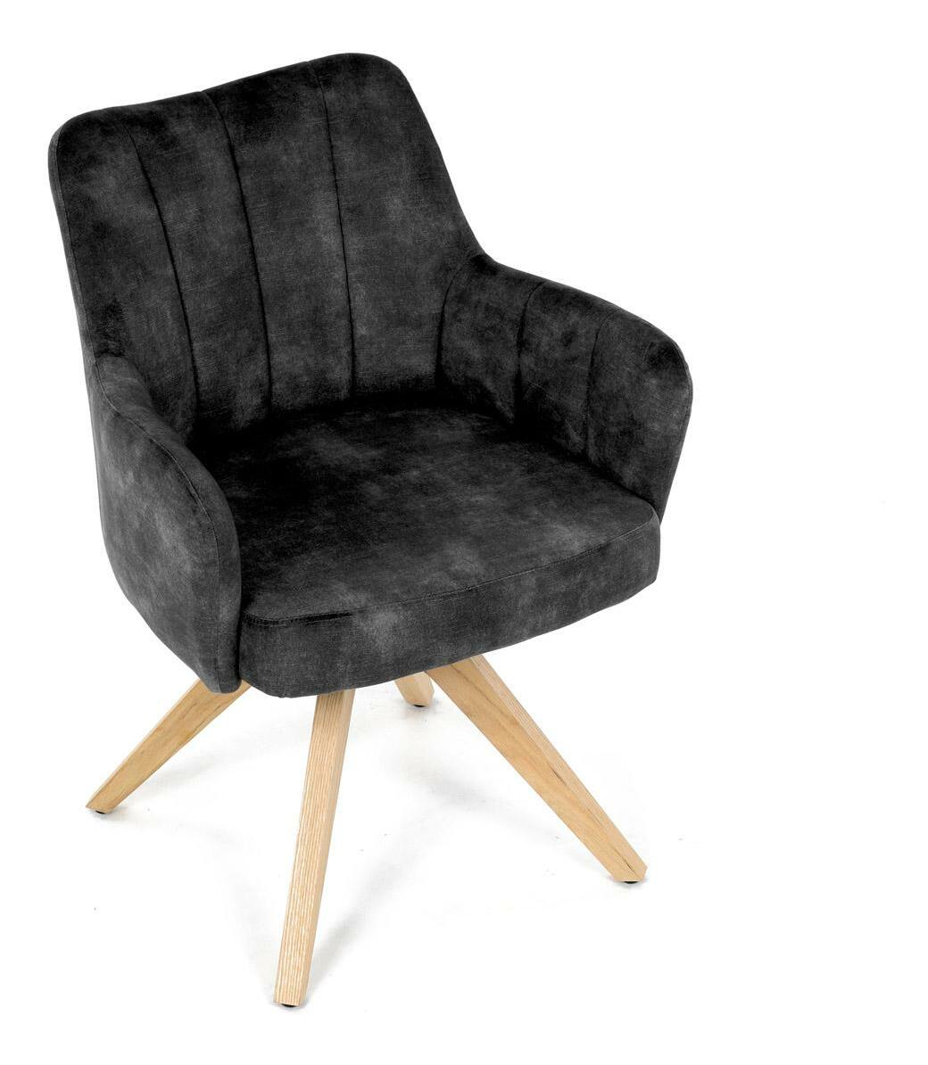 Elegantná čalúnená stolička zaujme na prvý pohľad svojou čiernou zamatovou látkou, ktorá dodáva interiéru moderný šmrnc. Masívne nohy v prírodnej farbe vytvárajú stabilný základ a skvele harmonizujú s celkovým designom. Komfortné podrúčky zaistia pohodlie pri sedení. Navyše, integrovaný 360 ° otočný mechanizmus poskytuje maximálnu flexibilitu a pohybový komfort. Ideálna voľba pre štýlové aj funkčné bývanie.