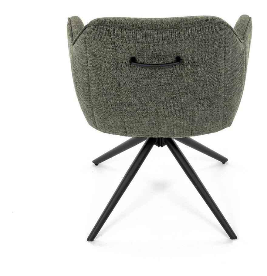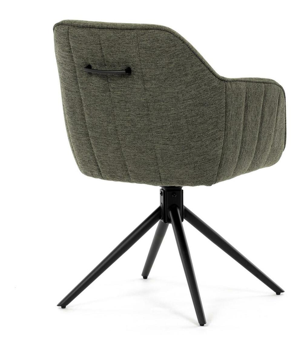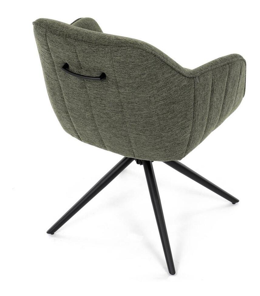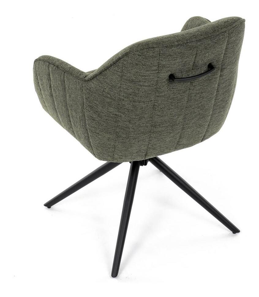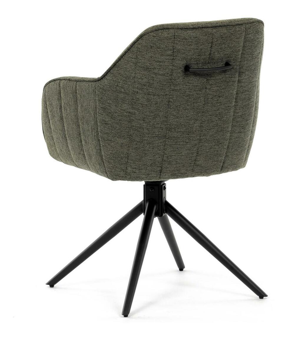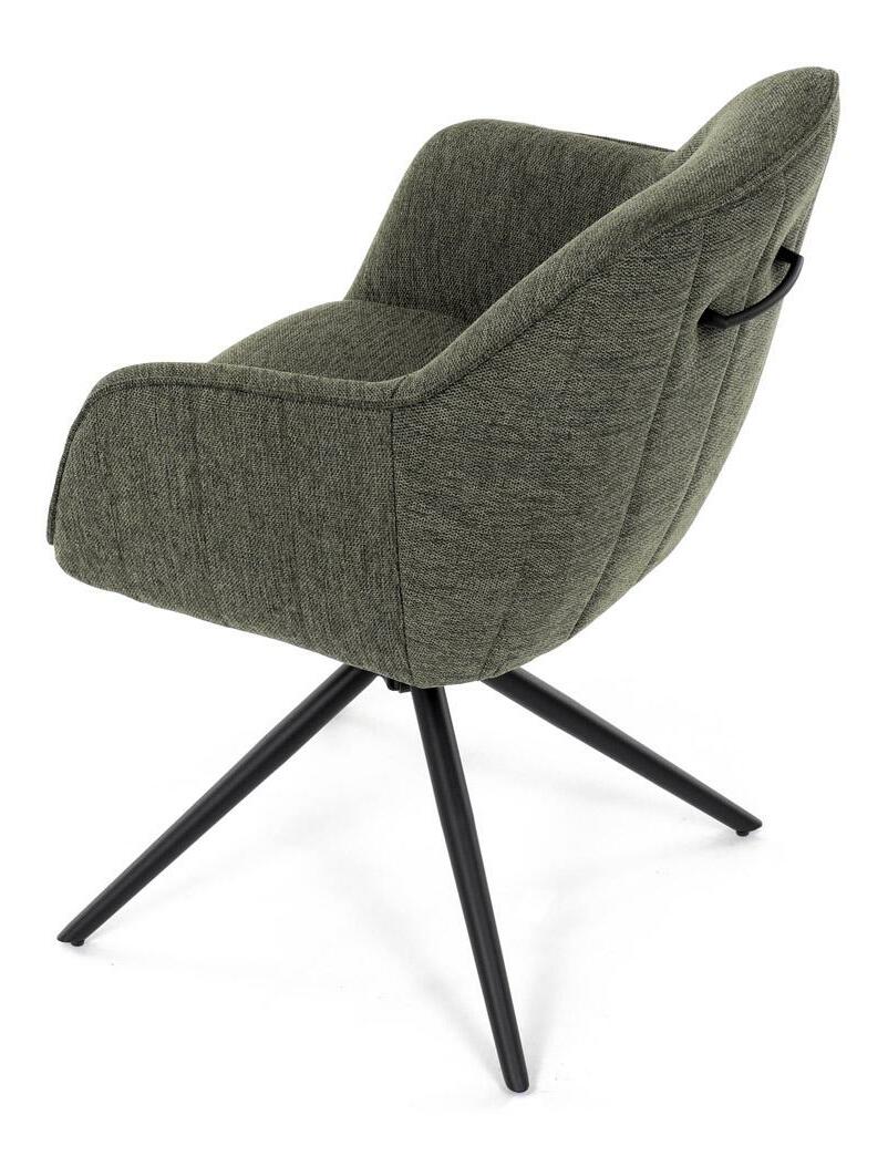 Moderná jedálenská stolička v zelenej barve s efektným prešitím chrbtovej aj prednej časti opierky. Prešitie je v farbe poťahového materiálu. Zadná časť opierky je doplnená vkusným držadlom pre ľahšiu manipuláciu. Štyri kovové nohy v matnom práškovom nástreku vychádzajú z centrálneho bodu v strede sedadla. Sedák je otočný o P90° L 90° s vratným mechanizmom - funkcia reset.