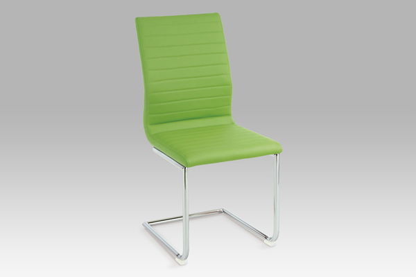 Zaujímavá jedálenská stolička s výrazným prešívaním na sedáku a opierke na chrbát. Kovové nohy sú pochrómované, čalúnenie je zelená koženka.