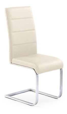 Moderná jedálenská stolička s elegantným dizajnom zaručí pohodlné sedenie vďaka čalúneniu z kvalitnej koženky. Tá je krémovej farby. Kovová konštrukcia je vo farbe chrómu.
