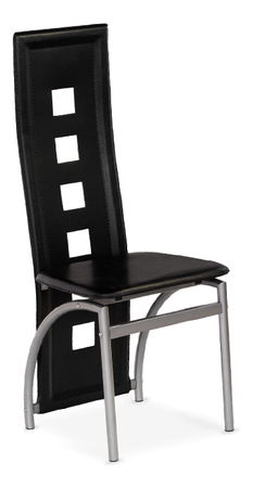 Dizajnová stolička vhodná do jedálne Vás uchváti svojim precíznym spracovaním. Operadlo so štvorcovými priehľadmi sa tiahnie po celej výške stoličky. Farbu čiernej koženky dokonale dopĺňa lakovaná oceľ.