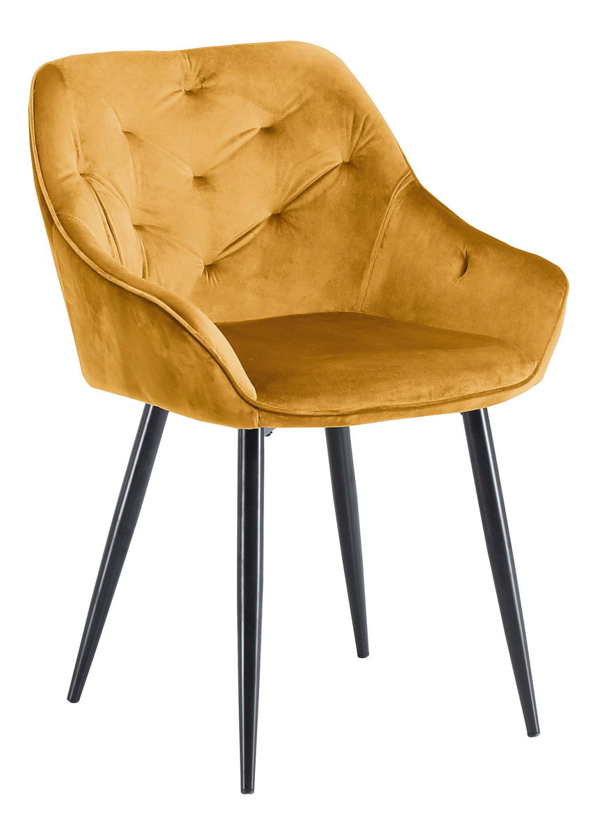 Jedálenská stolička Krysta v horčicovej farbe s čiernymi kovovými nohami prináša do vášho jedálne šmrnc a pohodlie. Čalúnenie z jemného, na dotyk príjemného materiálu vytvára ideálne miesto na dlhé večere či rodinné stretnutia.
