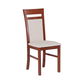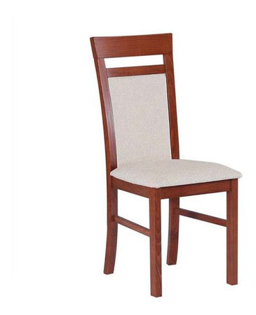 Jedálenská stolička sa so svojím elegantným štýlom hodí do jedální zariadených v rustikálnom a klasickejšom štýle. Má ozdobne tvarované operadlo s vodorovným výrezom. Operadlová časť a sedacia časť stoličky sú čalúnené.