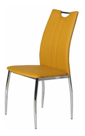 Pekná jedálenská stolička, ktorá má zaoblené operadlo s výrezom vo vrchnej časti a zaoblené chrómové nožičky. Farebné prevedenie stoličky je žltá kari. Výška sedenia je 45,5 cm.