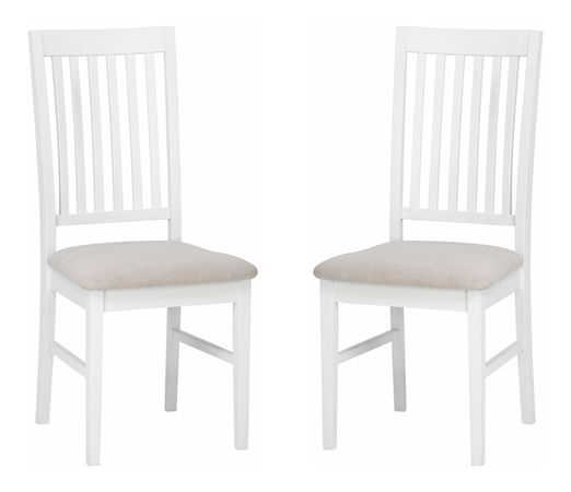 Elegantná jedálenská stolička v bielom prevedení s poťahom v prevedení svetlej farby. V balení sa nachádzajú 2 kusy stoličiek.