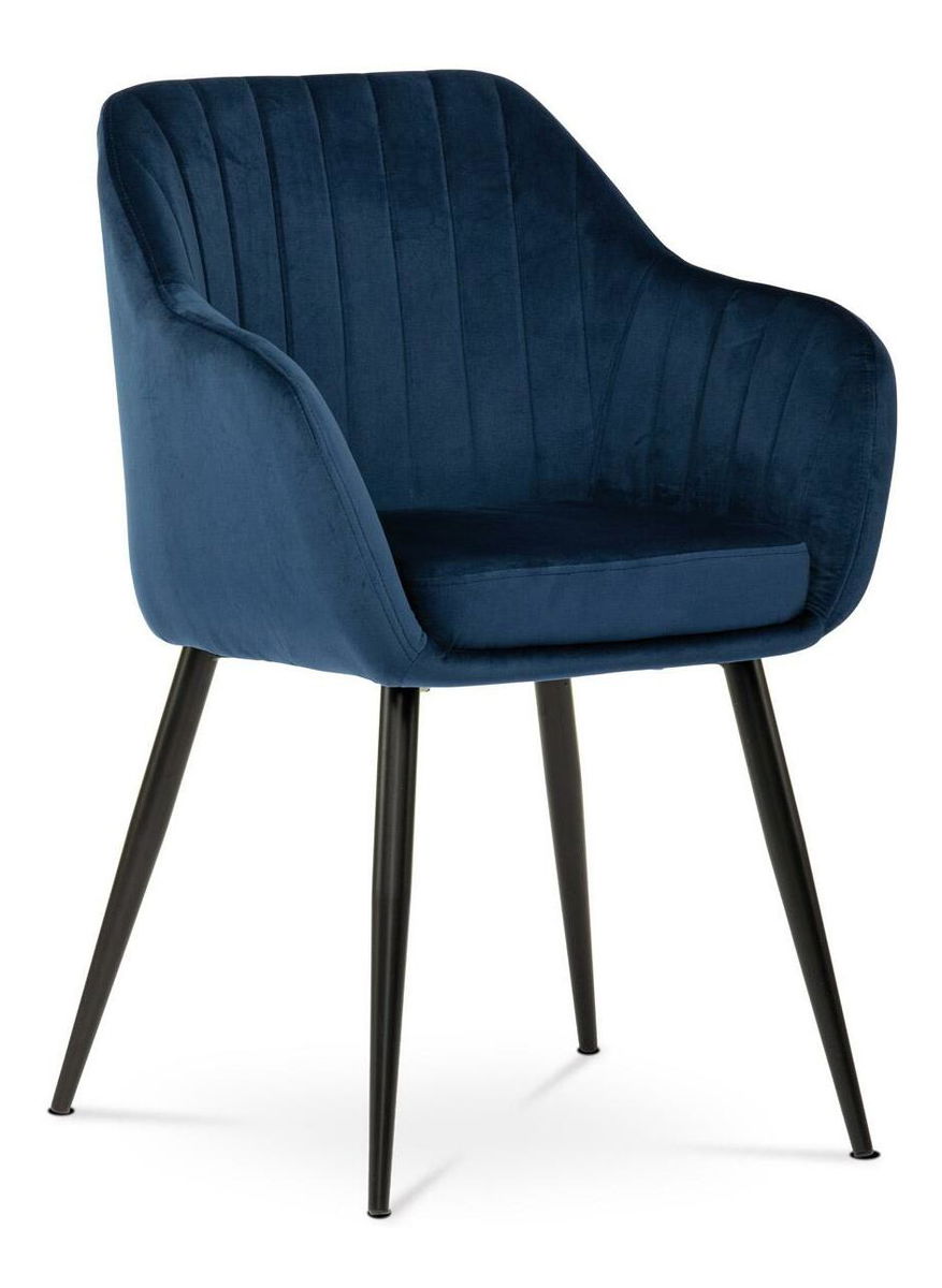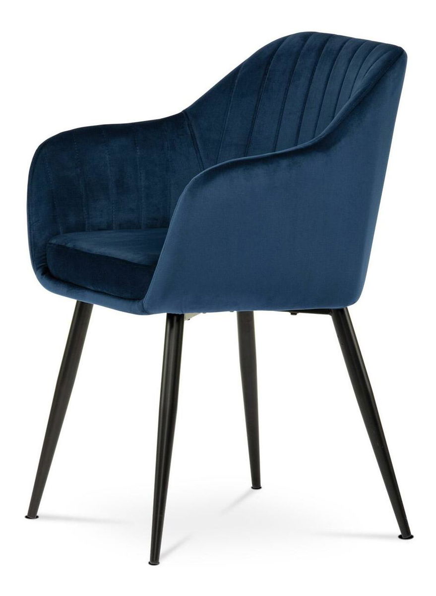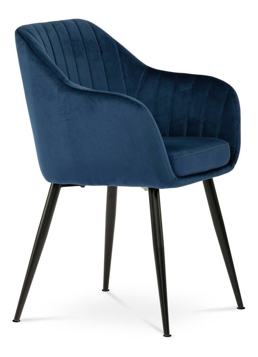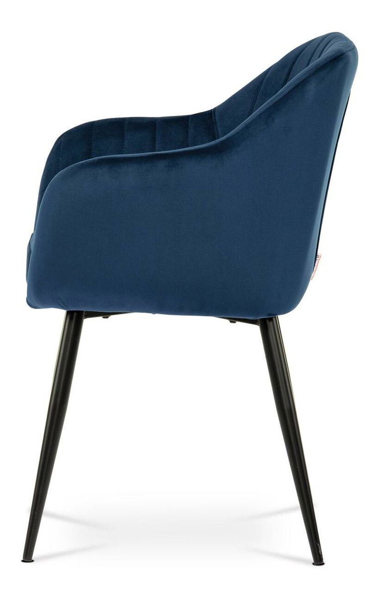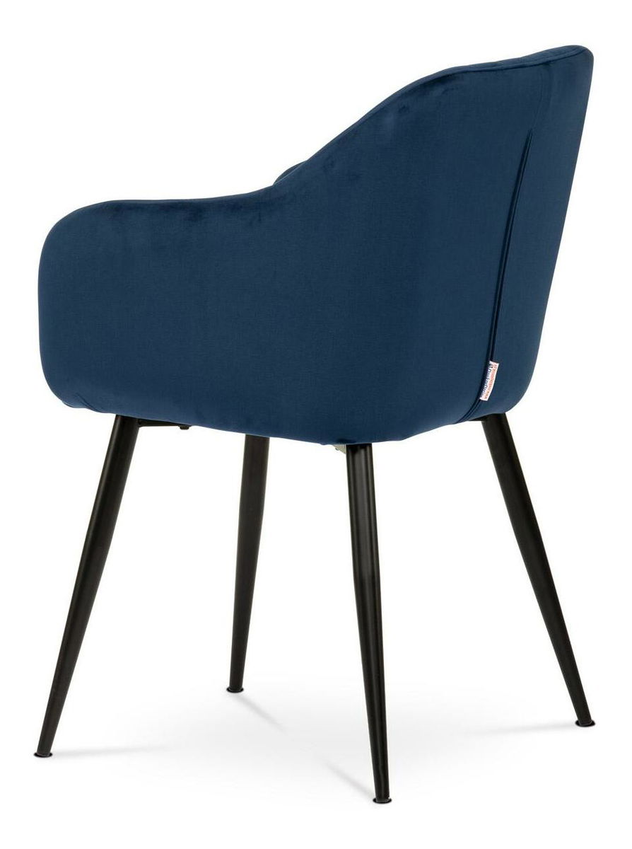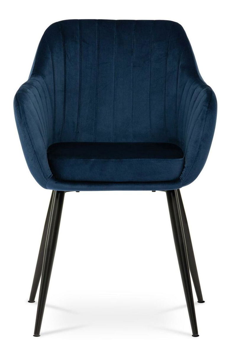 Dokonalý dizajn, industriálny štýl a perfektné pohodlie je pre túto stoličku samozrejmosťou. Škrupina sedadla i operadla má pevnú kovovú kostru, poťah z veľmi kvalitnej zamatovej látky v matnom prevedení a luxusnom odtieni NAVY modrej. Polstrovanie je z PU peny. Bonusom na zvýšenie pohodlia posedu je 8 cm zvýšený a extra polstrovaný sedák a praktické pohodlné opierky s opornou plochou vo výške 69 cm od podlahy. Príjemný dekoratívny prvok vytvárajú zvislé prešitie vnútorných častí operadla aj bokov. Použitá látka je veľmi odolná a perfektne sa čistí. Stabilitu stoličky zaisťujú štyri kónické kovové nohy s kvalitným práškovým nástrekom v čiernej matnej farbe. Ukončené sú čiernymi plastovými klzákmi, zabraňujúci poškodeniu tvrdých povrchov podláh. Nohy majú kruhový prierez s priemerom od 2 do 3,5 cm v hornej časti. Všetky tieto plus produkujú z tohto modelu skvelú voľbu pre Váš výber zariadení jedálenských alebo obývacích priestorov, ale skvele sa hodia aj ako konferenčné stoličky do zasadacích miestností. Nosnosť stoličky je až 120 kg. Základné rozmery sú - celková šírka 58 cm, celková hĺbka 57 cm, celková výška 84 cm, výška sedu 52 cm a hĺbka sedu 43 cm.
