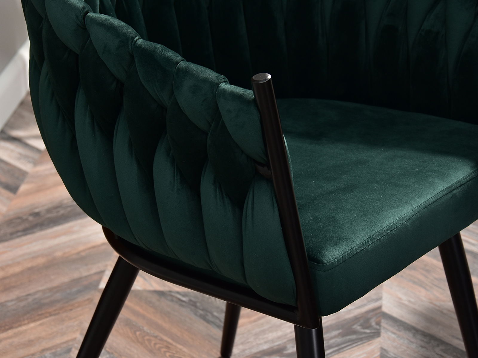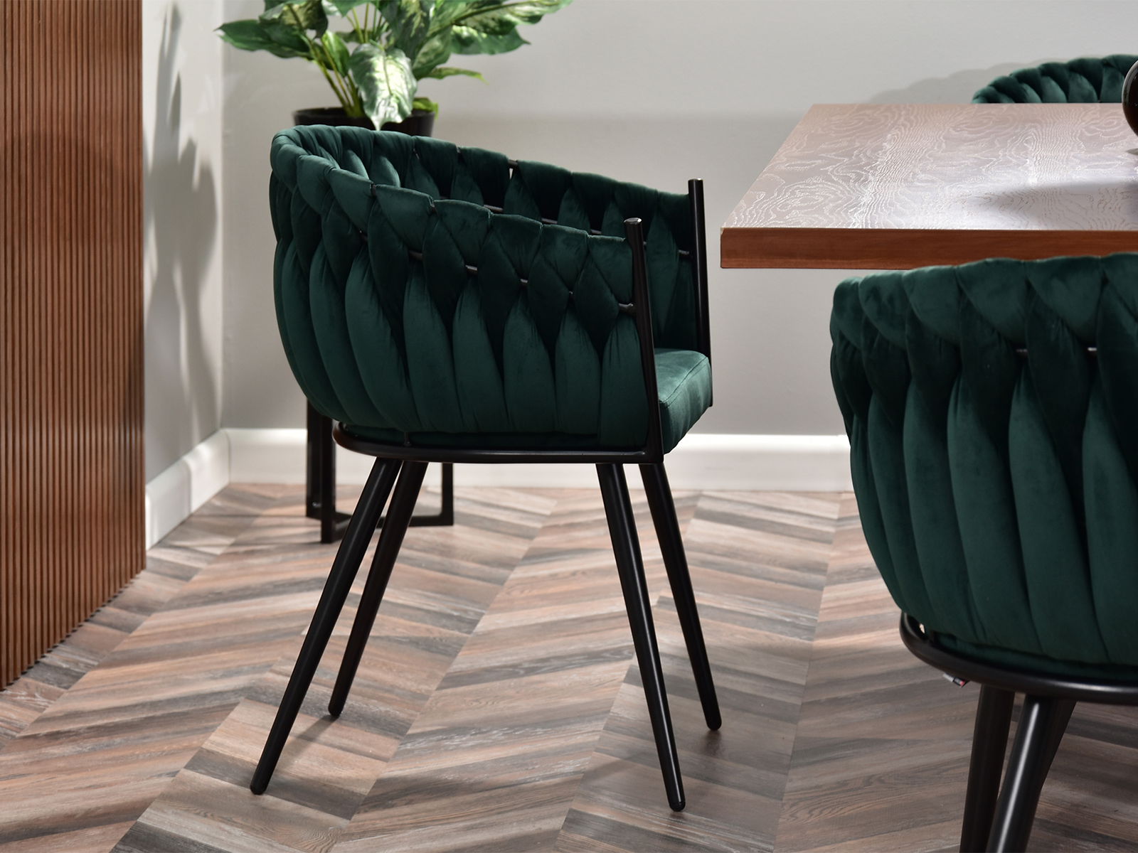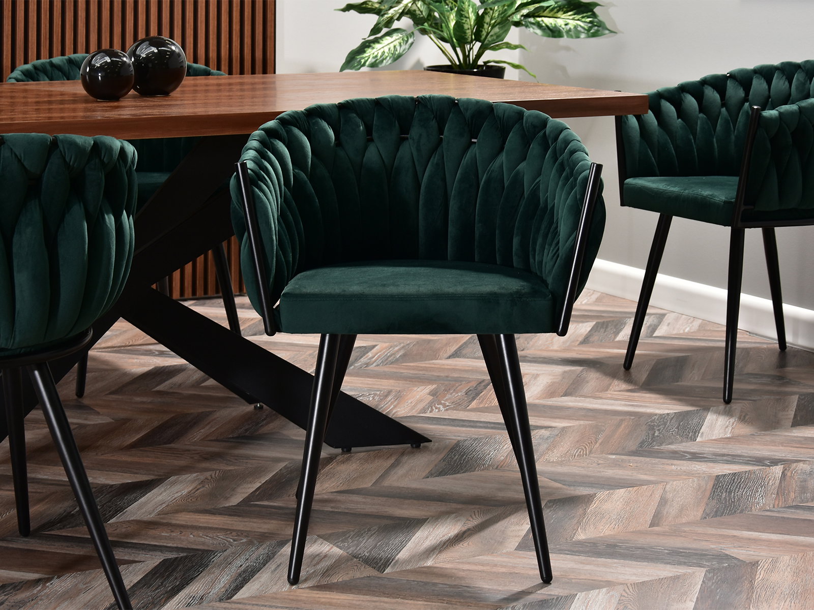 Táto jedálenská stolička v zelenej farbe s čiernou kovovou základňou je vhodným doplnkom do moderných interiérov, ktoré ocenia spojenie komfortu a štýlu. Jej pevná kovová konštrukcia so štyrmi nohami zaručuje stabilitu a dlhú životnosť, zatiaľ čo čalúnený sedák a operadlo s podrúčkami poskytujú pohodlie pri dlhšom sedení.