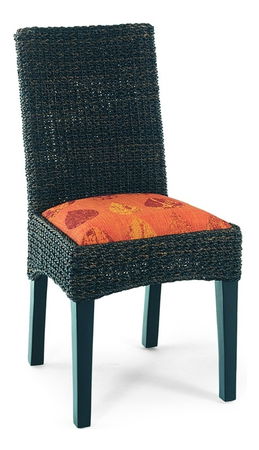 Jedálenská stolička s nohami z masívneho dreva v čiernej farbe, výplet z morskej trávy v tmavej farbe a sedákom oranžovom vzorovanom prevedení.