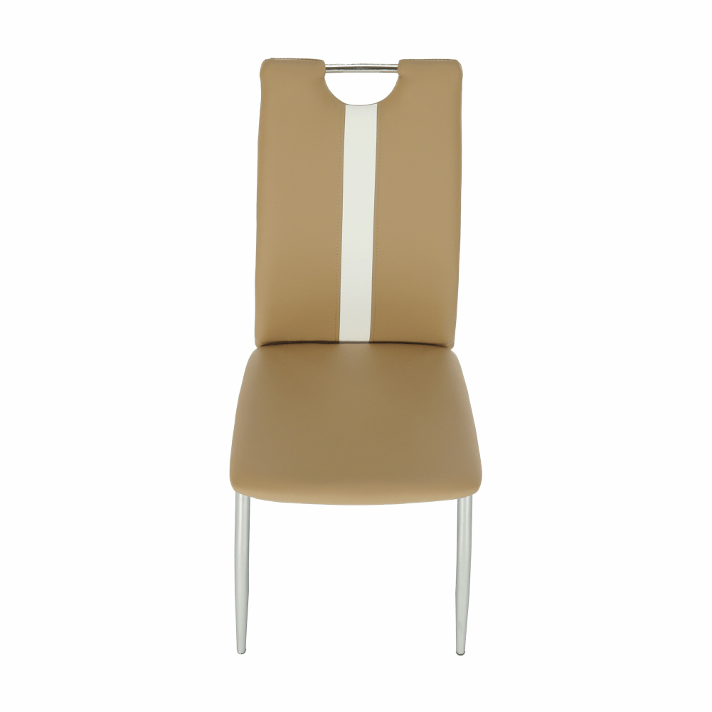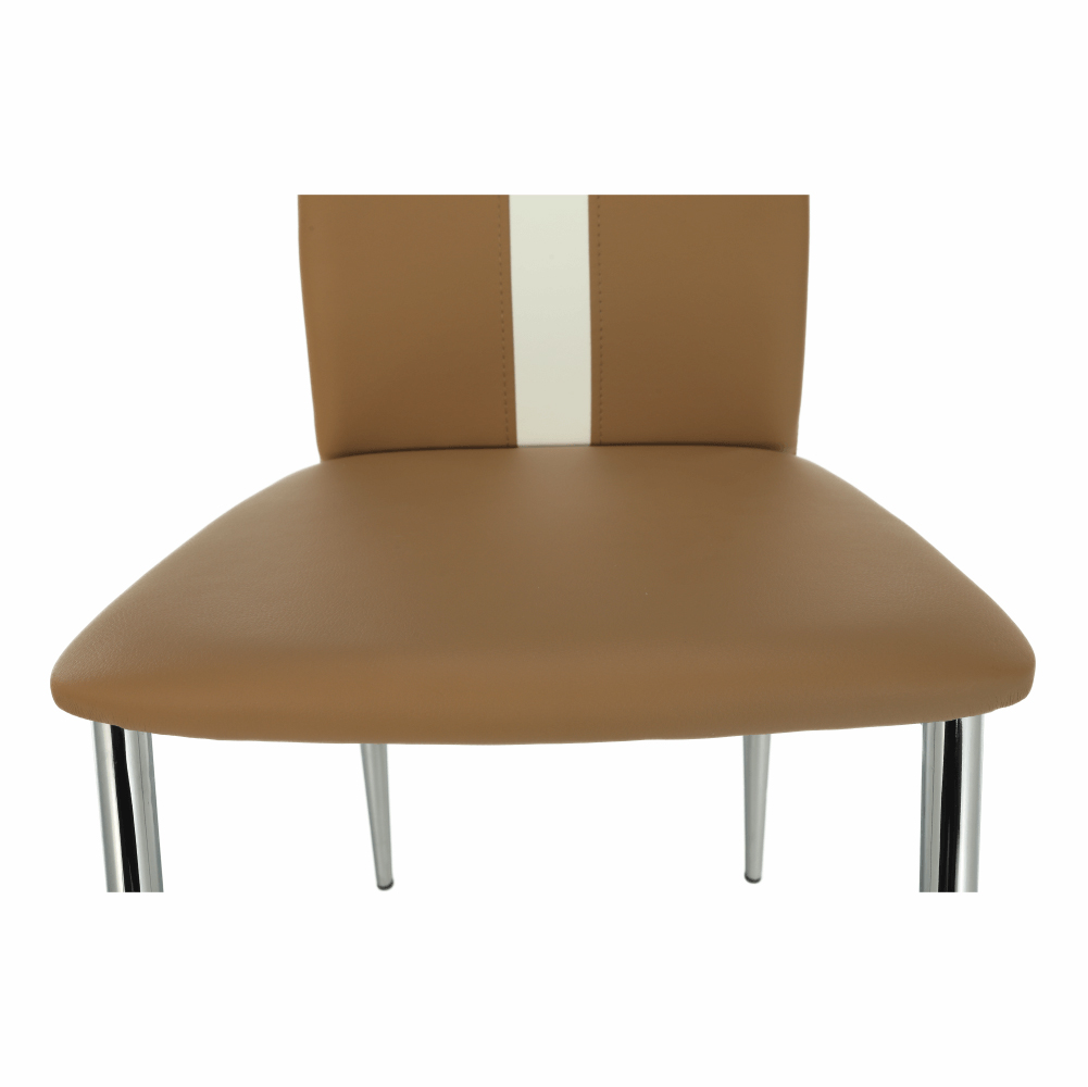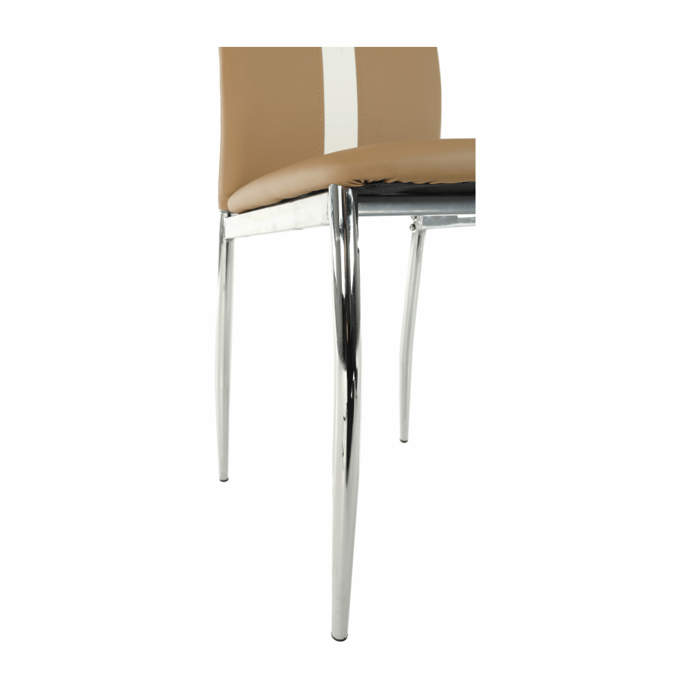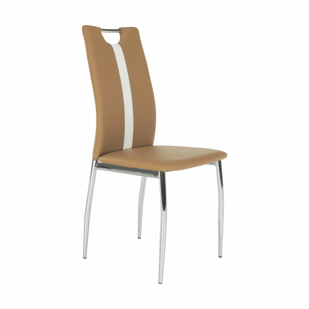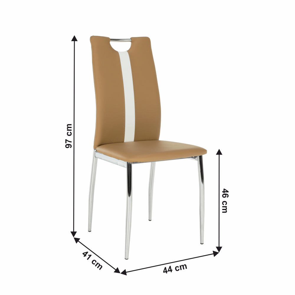 Moderná jedálenská stolička Signa je v ekokoži s pásom v strede má nosnosť 110 kg. Stabilnú konštrukciu zaručujú chrómové nožičky.