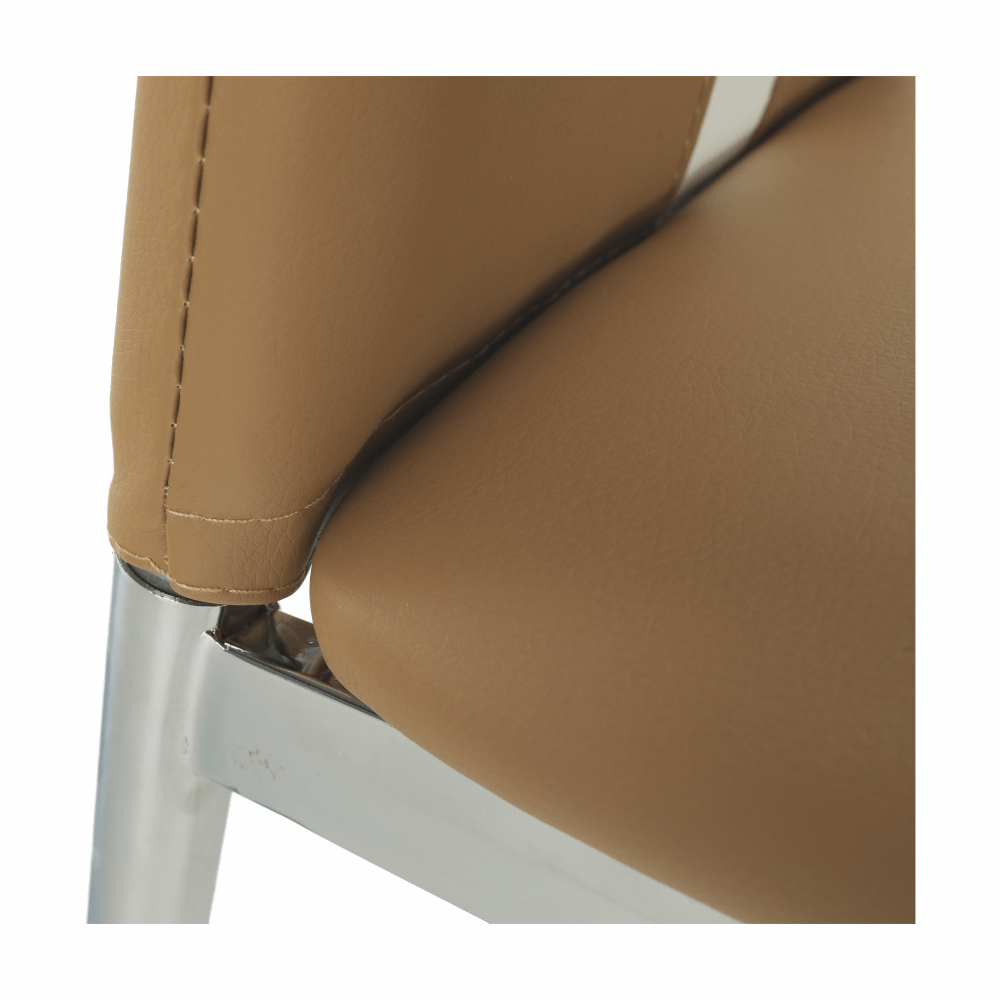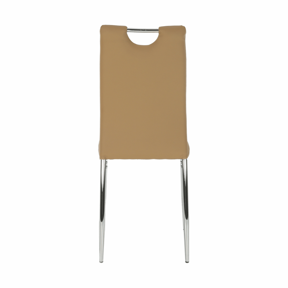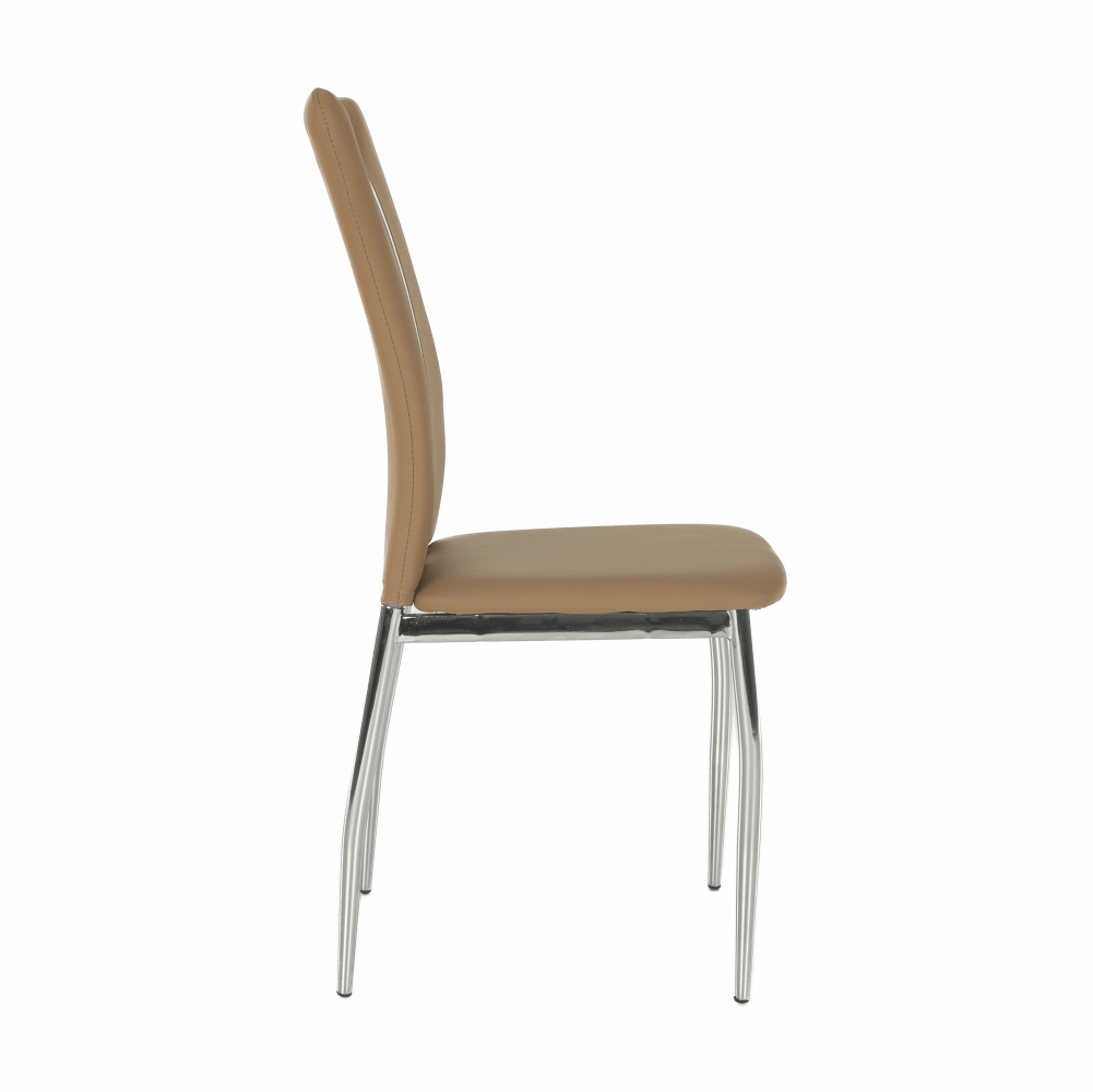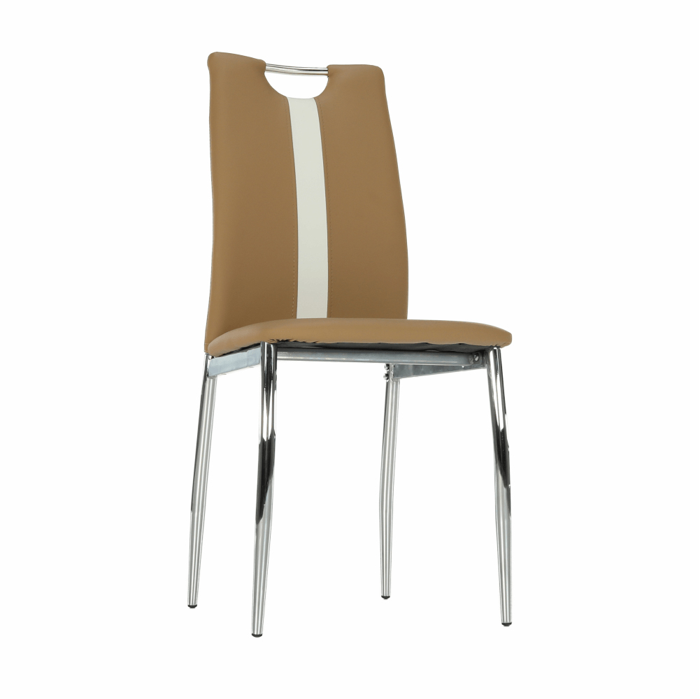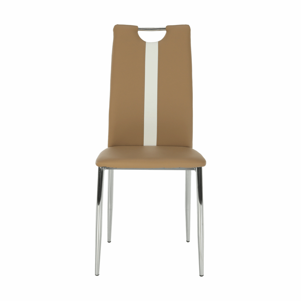 Moderná jedálenská stolička Signa je v ekokoži s pásom v strede má nosnosť 110 kg. Stabilnú konštrukciu zaručujú chrómové nožičky.