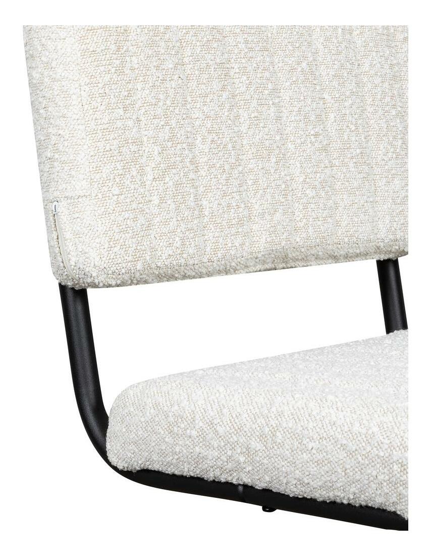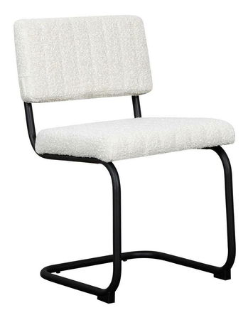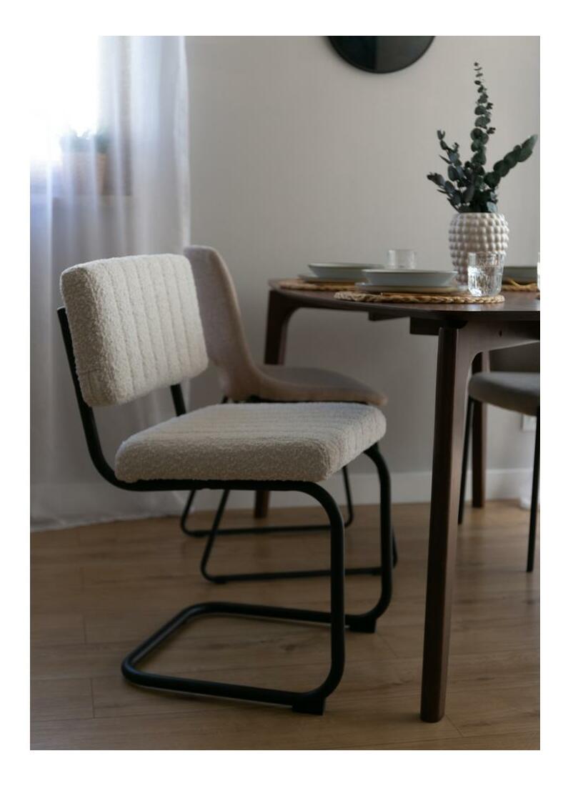 Stolička na behúňach je vkusný model, ktorý sa perfektne hodí do moderných a štýlových interiérov Biele čalúnenie je vyrobené z kvalitnej látky boucle - jedinečnej látky, mimoriadne príjemnej na dotyk a atraktívnej. Sedák a operadlo sú čalúnené touto látkou, vďaka čomu je stolička pohodlná aj na dlhodobé sedenie. Tvarované operadlo poskytuje dostatočnú oporu chrbta, čo zvyšuje komfort používania. Kvé nohy stoličky dodávajú celku stabilitu a odolnosť a tiež dodávajú stoličke moderný charakter. Stolička na pojazdoch je nielen funkčným kusom nábytku, ale aj krásnym dekoratívnym prvkom, ktorý podčiarkne jedinečný charakter vášho interiéru. Skvele sa bude vynímať v jedálni, obývačke, pracovni alebo aj spálni Detaily produktu: boucle látka - jedinečný typ látky s charakteristickou textúrou nadýchaných slučiek, dodáva eleganciu a komfortu Jemná biela farba poťahu a klasika čierne nohy vytvárajú vkusnú a harmonickú kombináciu, chýbajúce podrúčky umožňujú, aby sa stoličky perfektne zasúvali pod stolovú dosku štandardnej výšky a kvé nohy zaručujú nábytku náležitú stabilitu a značnú odolnosť.