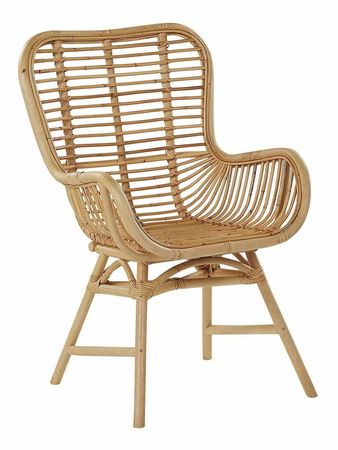 Táto pohodlná ratanová stolička vytvorí vo vašom interiéri letnú atmosféru. Zaoblený dizajn s vysokým operadlom ponúka úžasný komfort počas dlhých hodín strávených čítaním vašej obľúbenej knihy. Je vyrobená z robustného, ľahko udržiavateľného ratanu v prírodnej farbe. Vďaka otvorenej štruktúre pôsobí vzdušným dojmom a je ideálnou voľbou do interiéru v akomkoľvek štýle.