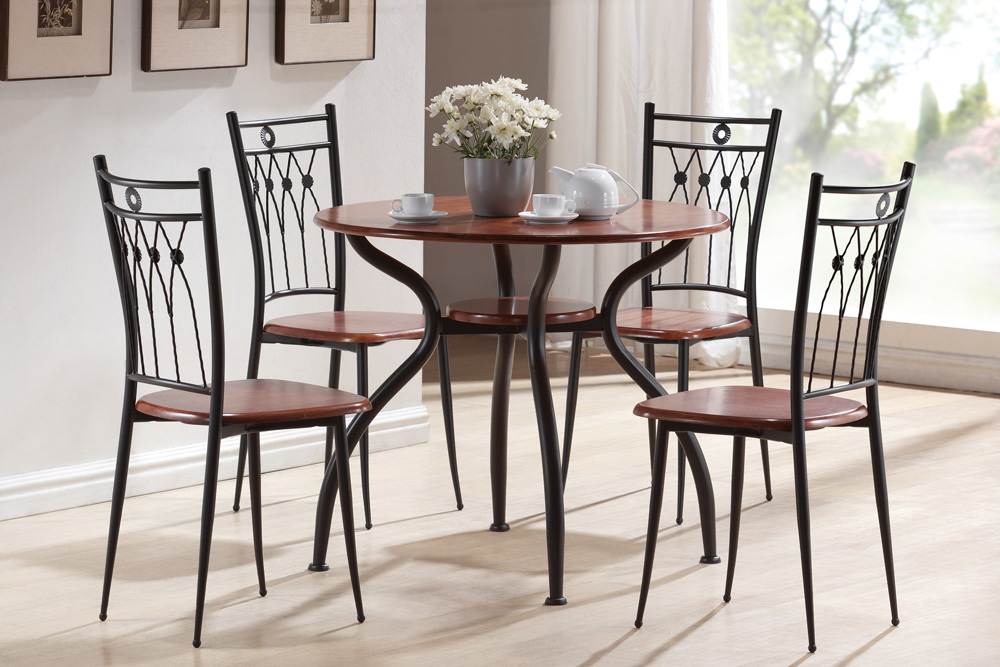 Jedálenská zostava Ambrozja I má elegantný a moderný štýl. Vrchná doska je v prevedení dreva vo farbe antickej čerešne, pod vrchnou doskou sa nachádza odkladací priestor, ktorý je tiež z dreva vo farbe antickej čerešne. Kovový rám je v matnej čiernej farbe. Zostava obsahuje aj 4 stoličiek, ktoré sú v rovnakom farebnom prevedení ako stôl. Za stôl usadne maximálne 4 osôb.