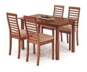 Štýlový jedálenský set. Skladá zo stola a 4 stoličiek. Zostava je vyrobená z kaučukového masívu, morená je do prevedenia čerešňa. Horná doska stola je z dýhy. Stoličky majú textilné čalúnenie a príjemný svetlý poťahu. Operadlo na chrbát nemá čalúnenie.