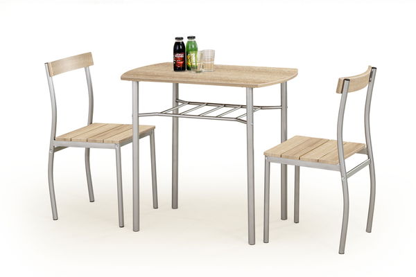 Jedálny set Lizze (pre 2 osoby) je ideálny pre tých, ktorí hľadajú funkčný a elegantný dizajn pre svoj jedáleň alebo kuchyňu. Tento set obsahuje stôl a dve stoličky, ktoré sú vyrobené z laminovanej MDF dosky s oceľovými nohami, ktoré sú lakované pre lepšiu ochranu pred poškodením. Vďaka svojmu dubu Sonoma farbe a modernému dizajnu, tento jedálny set bude skvelým doplnkom pre váš domov. Rozmery stola sú 75 cm výška a 50 cm hĺbka, čo z neho robí pohodlný a praktický výber pre malé miestnosti alebo kuchyne. Kvalita a dizajn tohto setu sú vynikajúce a zaručia vám spokojnosť a pohodlie pri každom jedle.